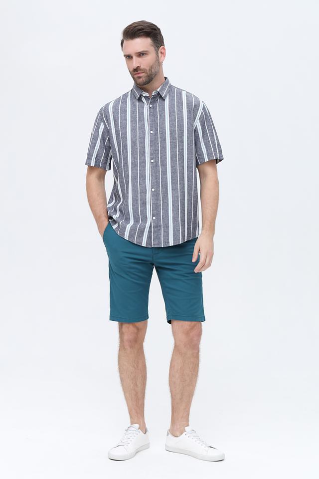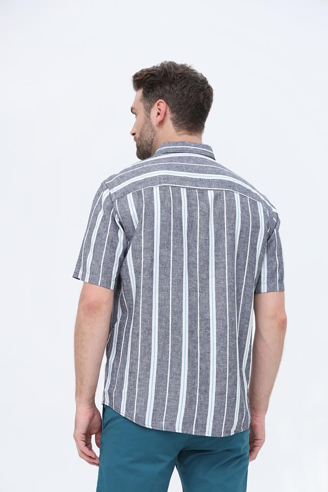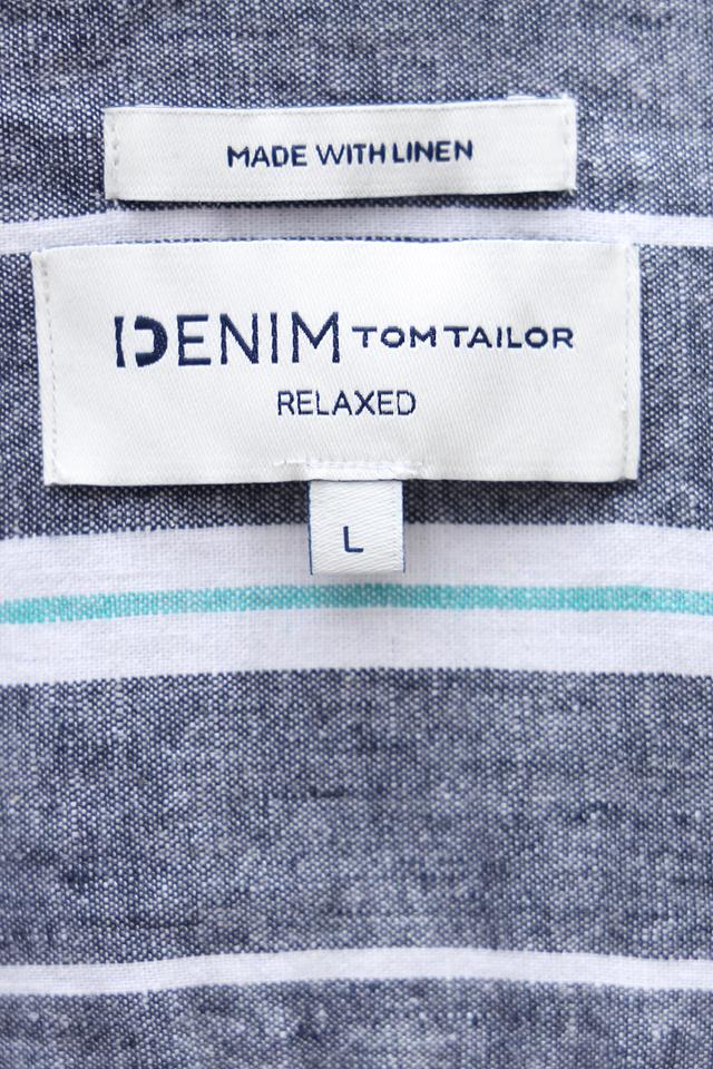 Мужская рубашка Tom Tailor denim boy синего цвета с коротким рукавом, выполнена в полоску. Изготовлена из льна и вискозы, обеспечивающих комфорт и воздухопроницаемость. Состав: лен 55%, вискоза 45%
