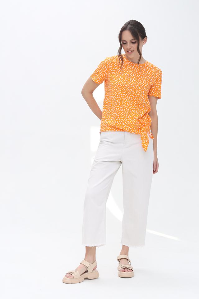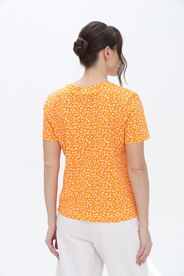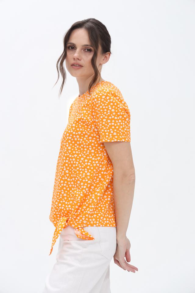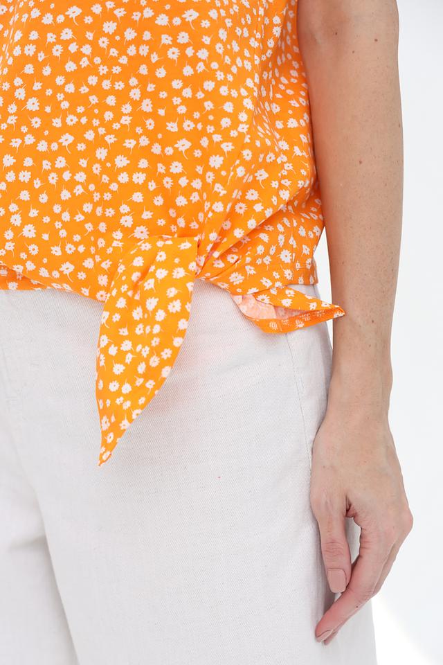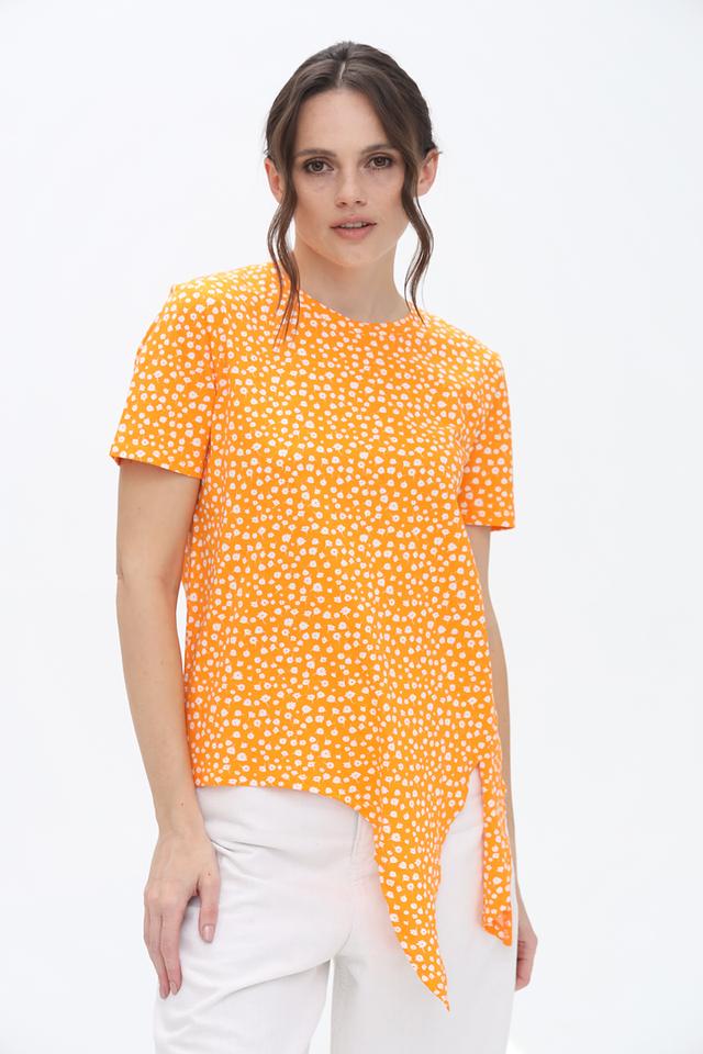 Блуза имеет оранжевый цвет с мелким белым цветочным принтом. Краткие рукава и округлый вырез горловины создают классический силуэт. Оригинальным элементом является завязка на талии, которая позволяет подчеркнуть фигуру и придать образу женственность.