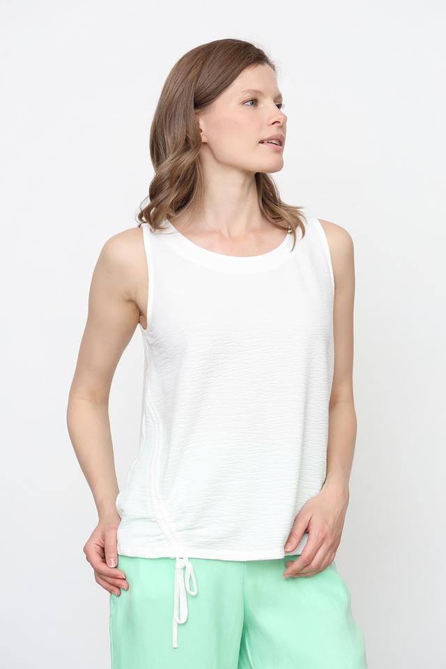 Топ имеет классический крой без рукавов и округлый вырез горловины. Боковые завязки позволяют регулировать силуэт и создавать различные образы. Эта модель идеально подходит для повседневной носки, сочетается с джинсами, шортами, юбками и брюками.