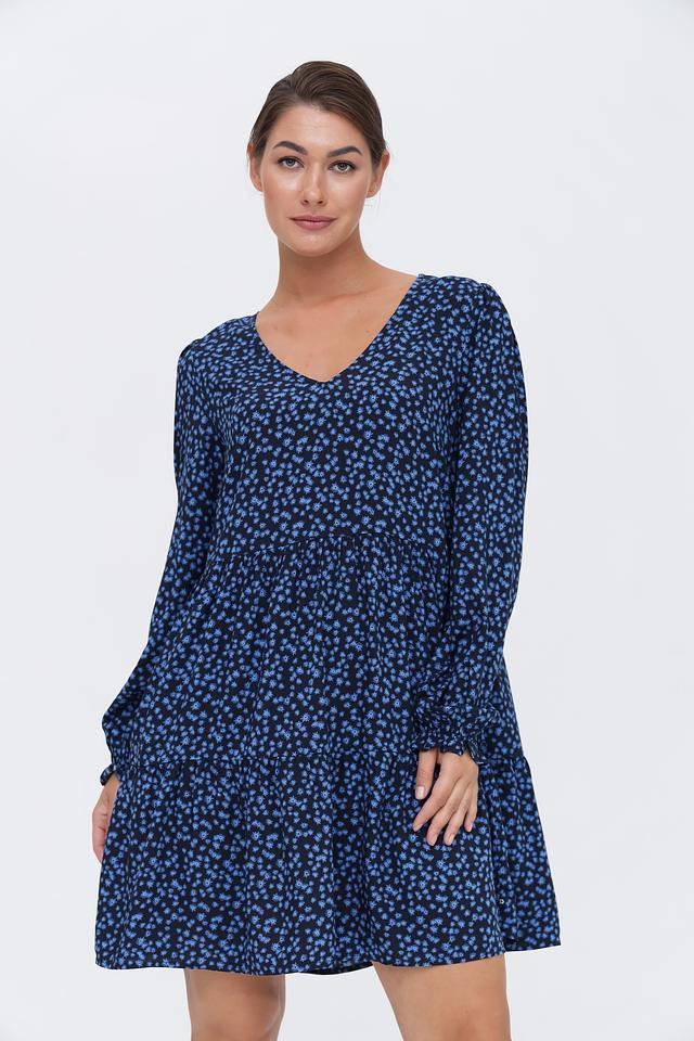 Основной цвет платья – тёмно-синий, который служит идеальным фоном для мелкого цветочного принта голубого цвета. V-образный вырез горловины и длинные рукава с небольшими сборками на манжетах придают платью женственности и элегантности.