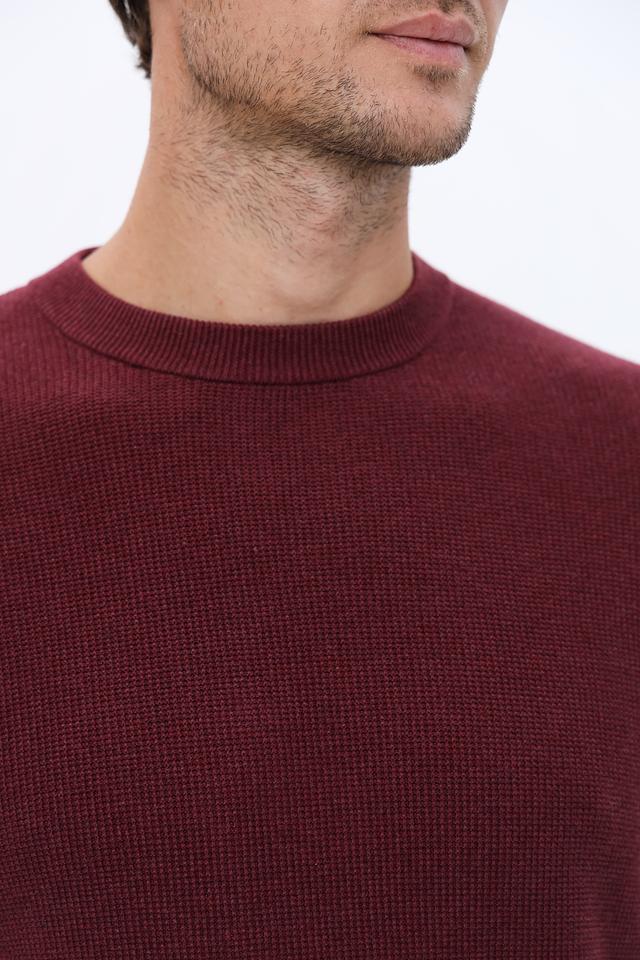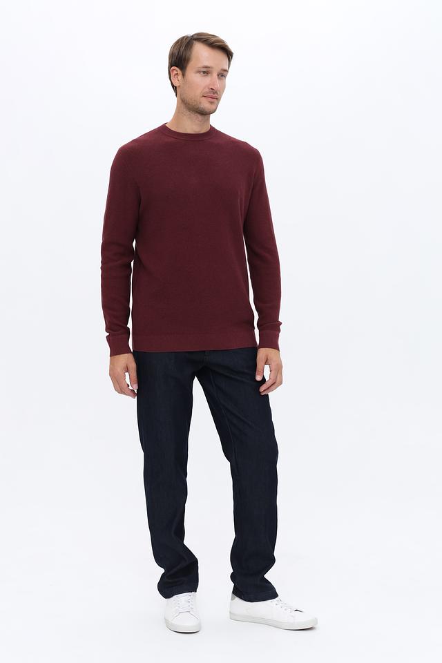 Джемпер имеет бордовый цвет и текстурную вязку, которая придает ему интересный вид. Классический крой с круглым вырезом горловины делает его универсальным и подходящим для различных случаев.