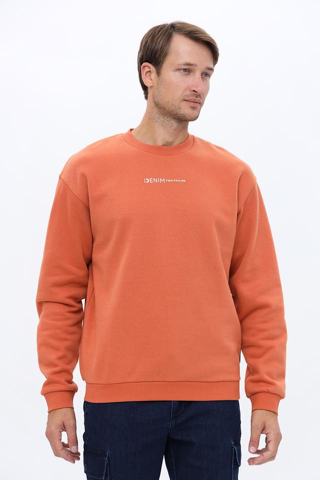 Модель имеет круглый вырез горловины и длинные рукава с манжетами. На груди расположена небольшая надпись "DENIM TOM TAILOR", выполненная в белом цвете, что добавляет толстовке стильный акцент.