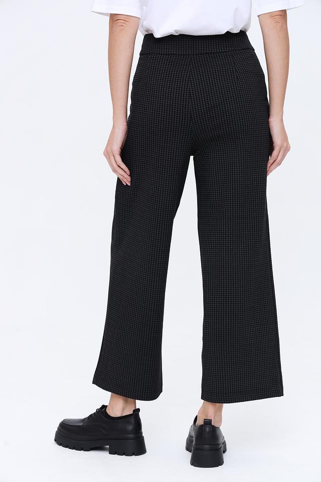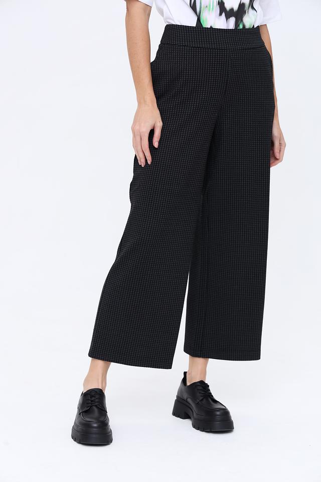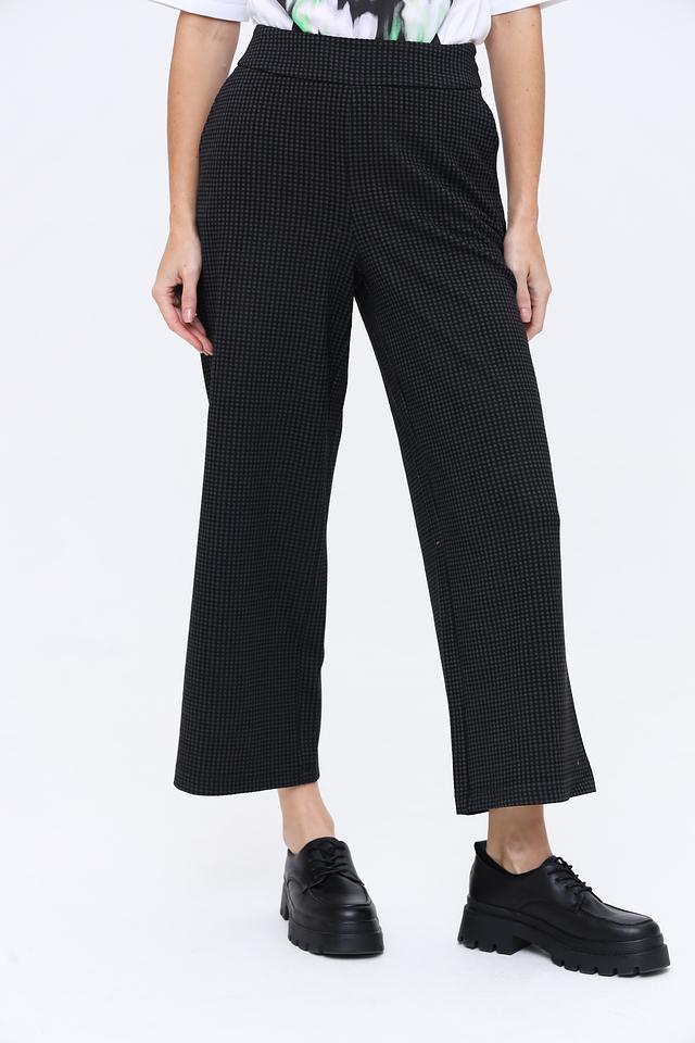 Брюки имеют классический чёрный цвет с актуальным принтом в клетку, который придаёт им современный вид. Прямой крой и высокая посадка визуально удлиняют ноги и подчеркивают талию. Эластичный пояс обеспечивает удобную посадку по фигуре.