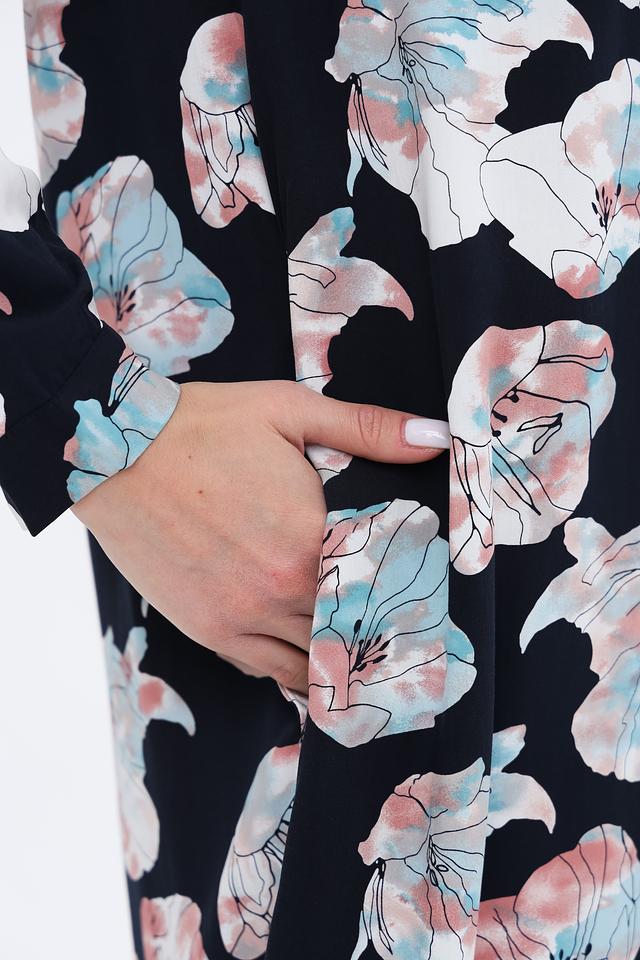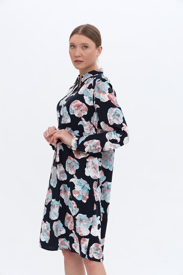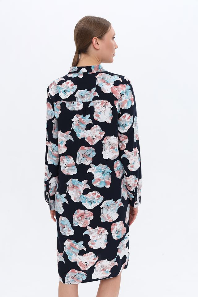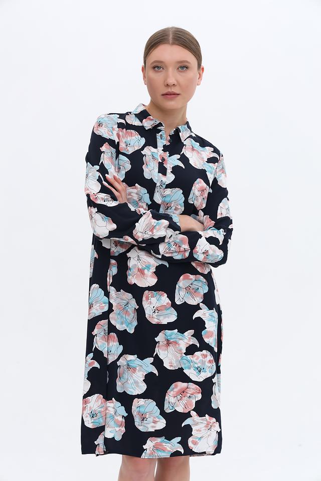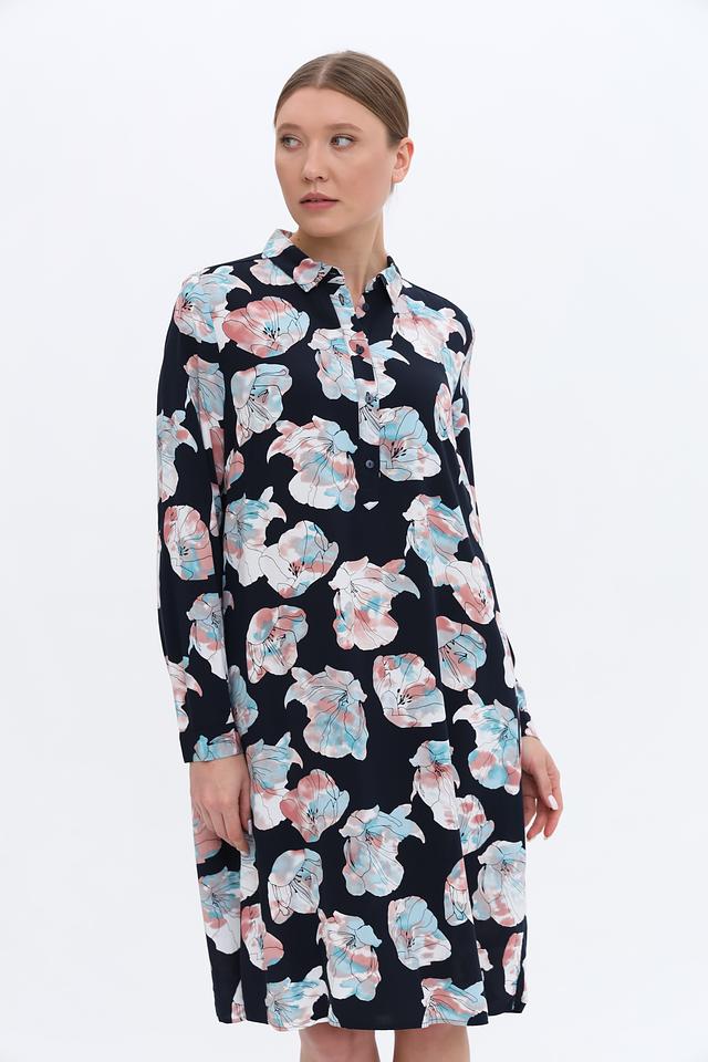 Модель имеет прямой силуэт, длинные рукава и воротник-стойку с V-образным вырезом, который застегивается на пуговицы. Платье выполнено из 100% вискозы, что делает его легким, приятным к телу и комфортным в носке.