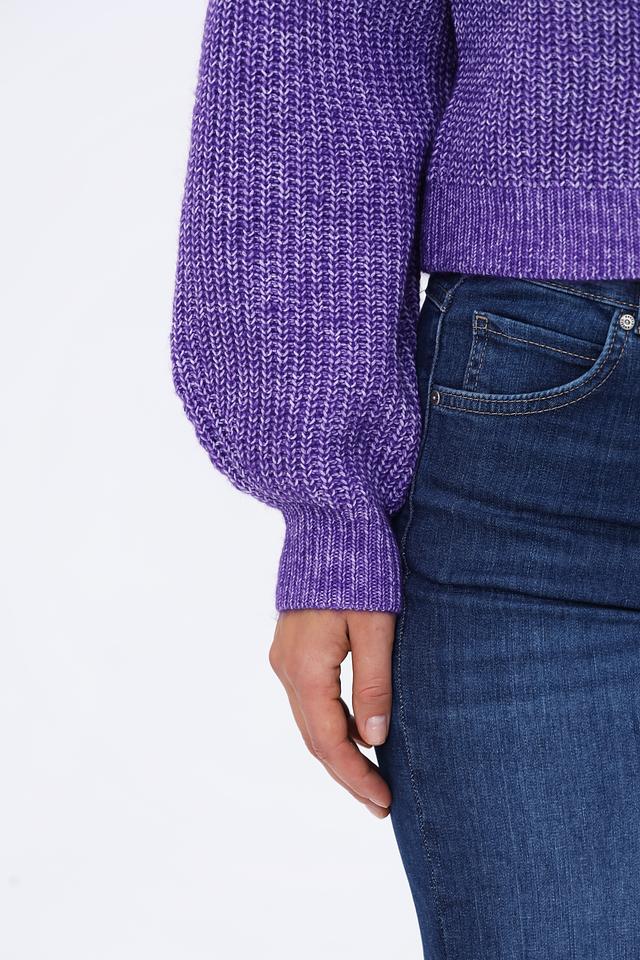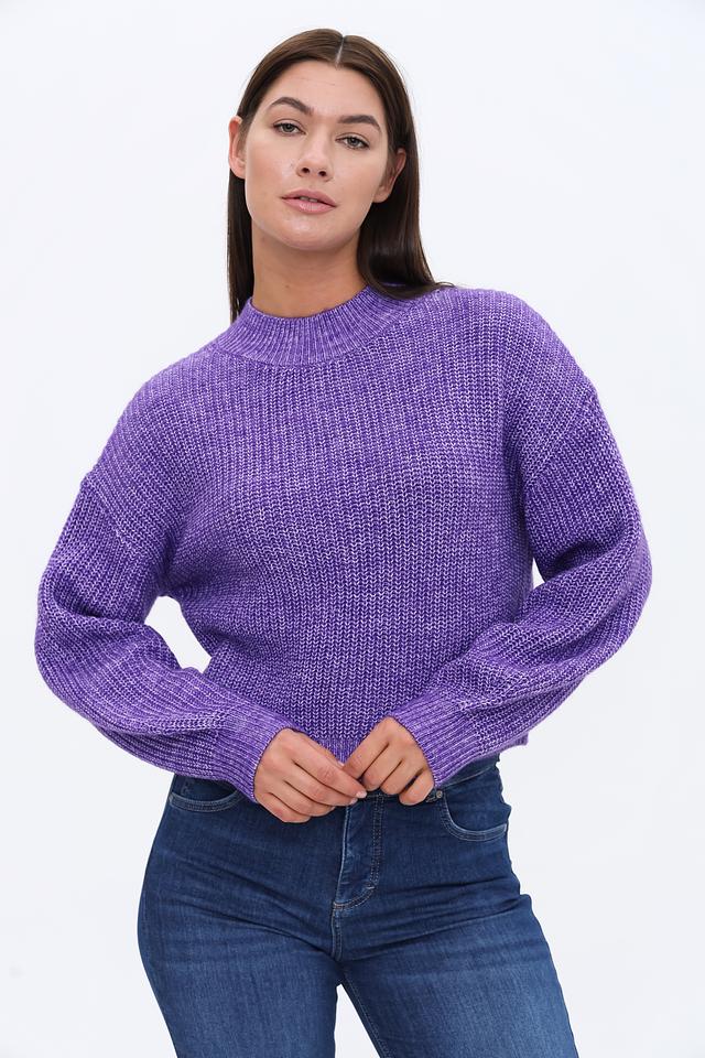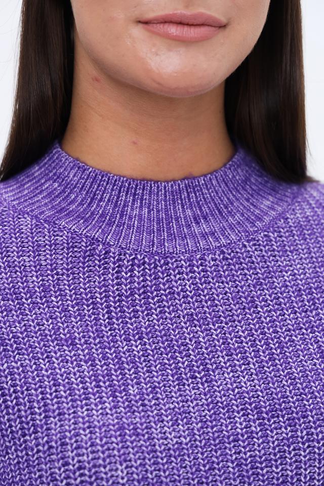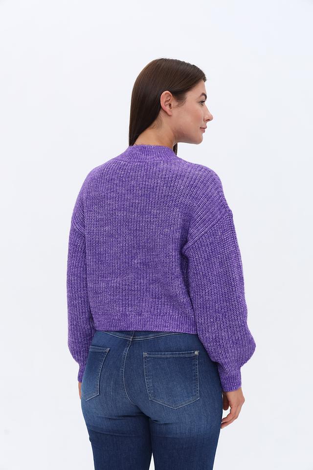 Модель имеет свободный крой, слегка спущенную линию плеч и округлый вырез горловины. Рукава объёмные, с манжетами. Текстура вязания крупная, что добавляет изделию объём и визуальный интерес.