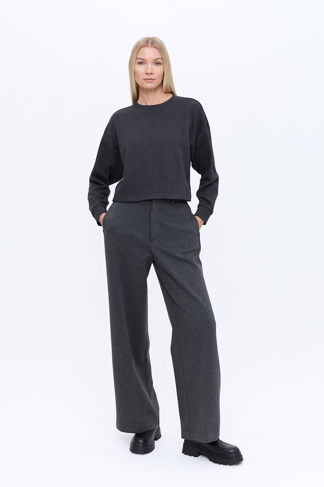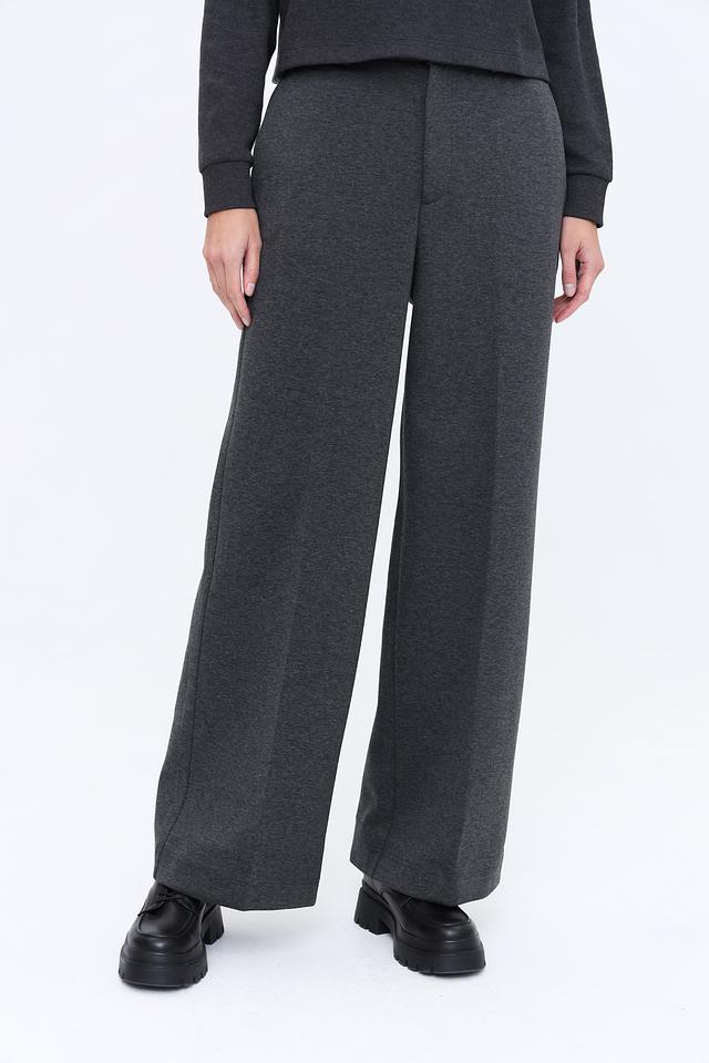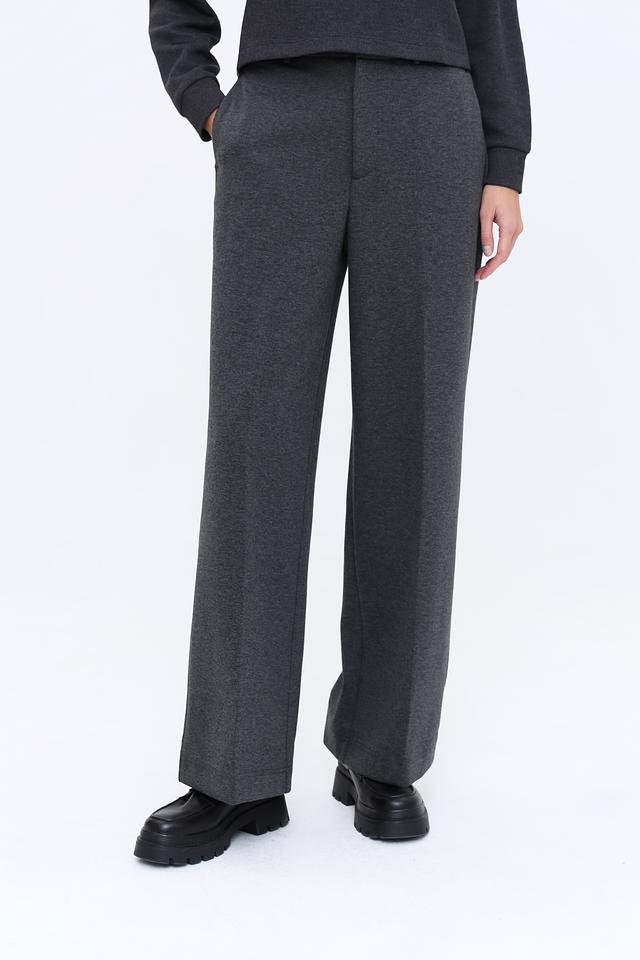 Брюки имеют прямой крой, высокую посадку и широкие штанины, что создает элегантный и современный силуэт. Застежка на молнию и пуговицу обеспечивает надежную фиксацию. Наличие боковых карманов добавляет функциональности.