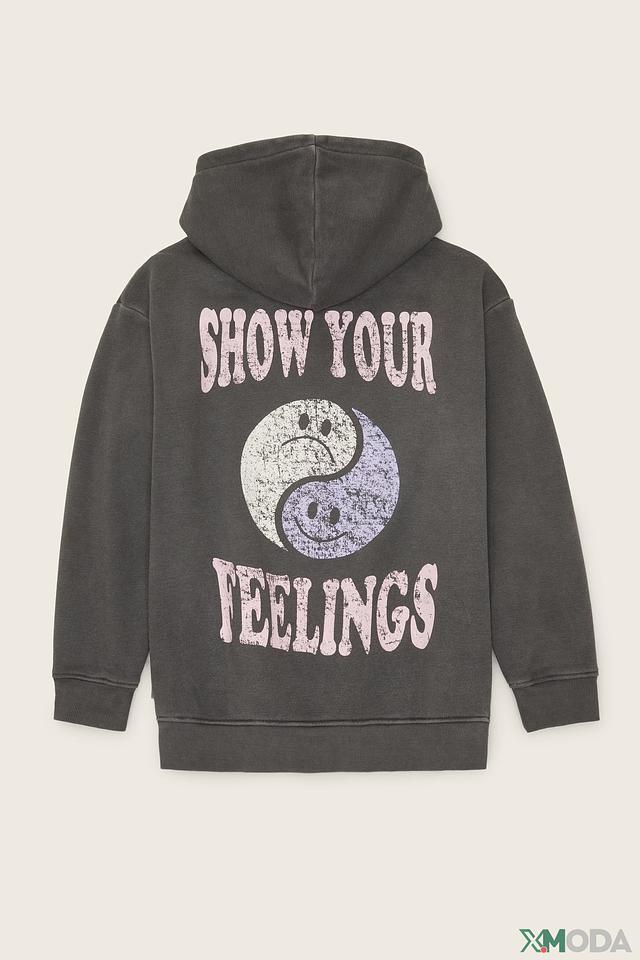 Джемпер имеет классический крой с длинными рукавами и удобным капюшоном. На спине расположен яркий принт с изображением лица, разделённого на две половины, символизирующего выражение чувств. Резинки на рукавах и по низу изделия обеспечивают плотное прилегание, не сковывая движений.