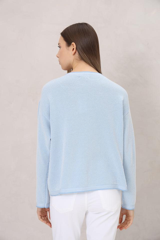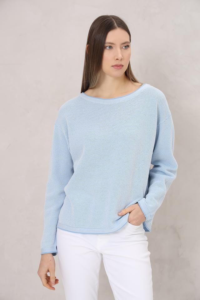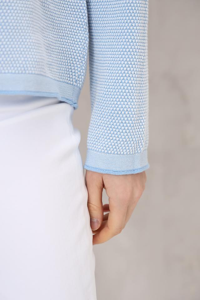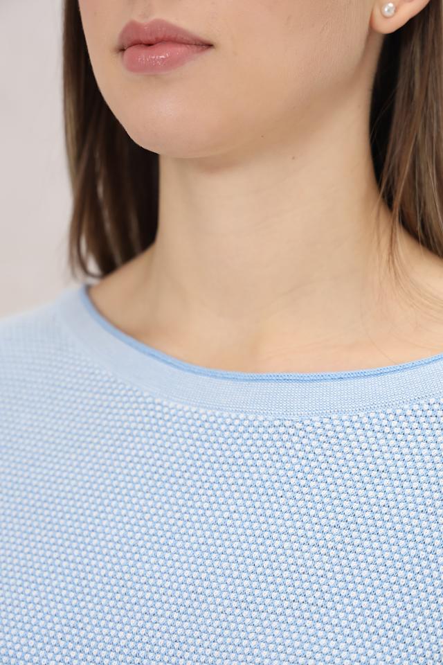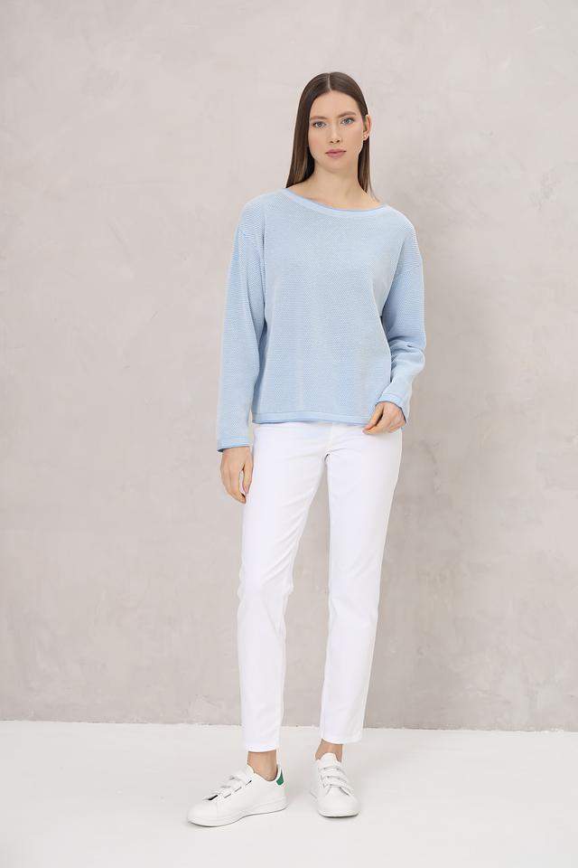 Модель имеет голубой цвет и ажурную текстуру, которая придает ей легкость и воздушность. Округлый вырез горловины и длинные рукава делают этот пуловер универсальным и подходящим для различных случаев.