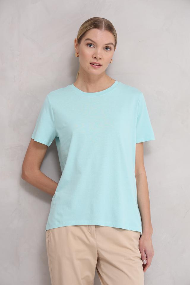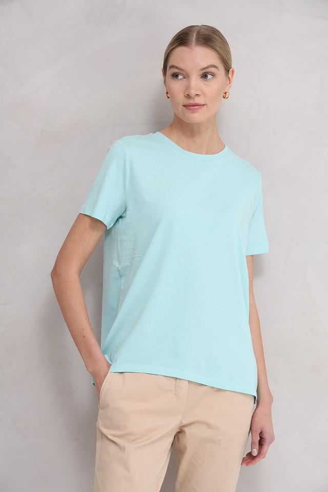 Благодаря своему светлому мятному оттенку, эта футболка легко сочетается с различными элементами гардероба. Она идеально подходит для создания как casual, так и более элегантных образов. Простой и лаконичный дизайн делает её универсальной и вневременной.