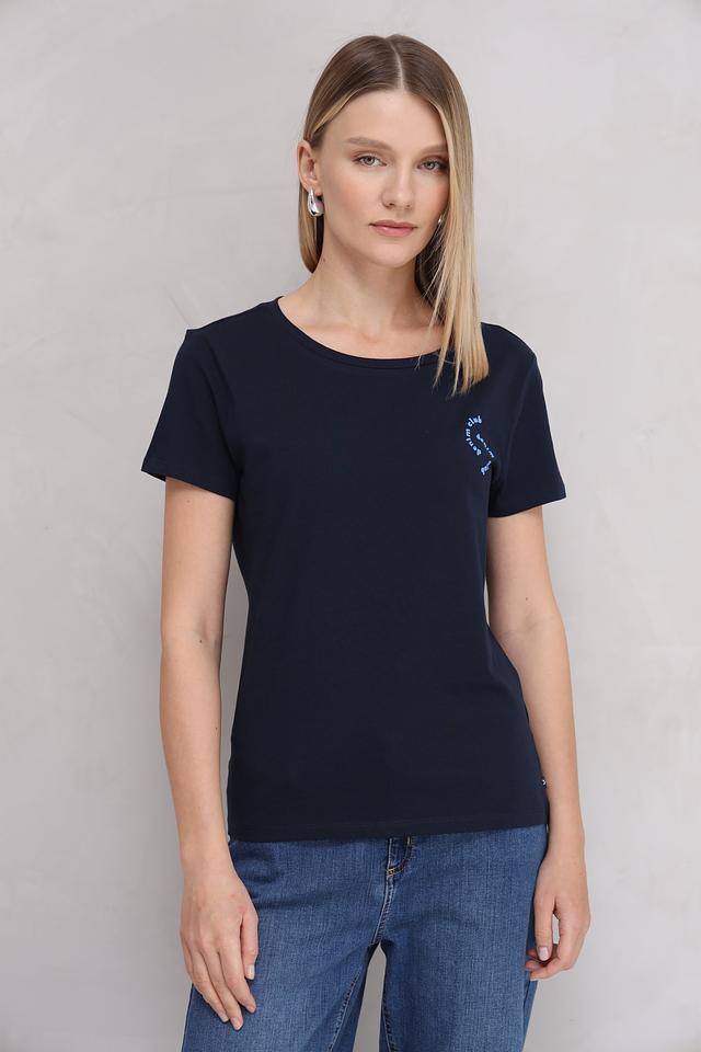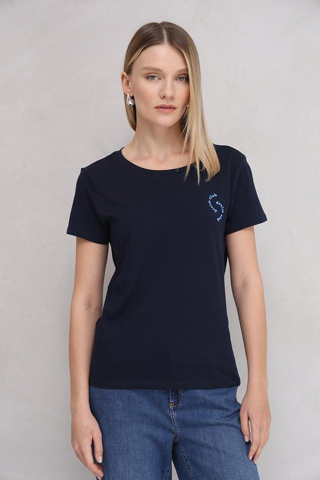 Благодаря своему лаконичному дизайну и насыщенному синему цвету, эта футболка легко сочетается с джинсами, шортами или юбками.