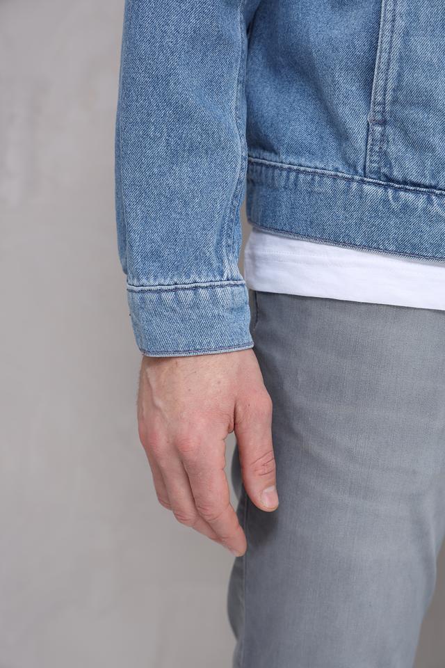 Куртка имеет классический джинсовый дизайн с отложным воротником, застежкой на пуговицах и двумя нагрудными карманами с клапанами. Прямой крой обеспечивает свободу движений, а голубой цвет легко сочетается с различными элементами одежды.