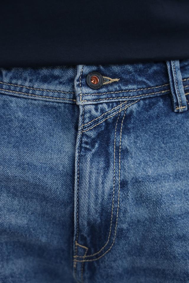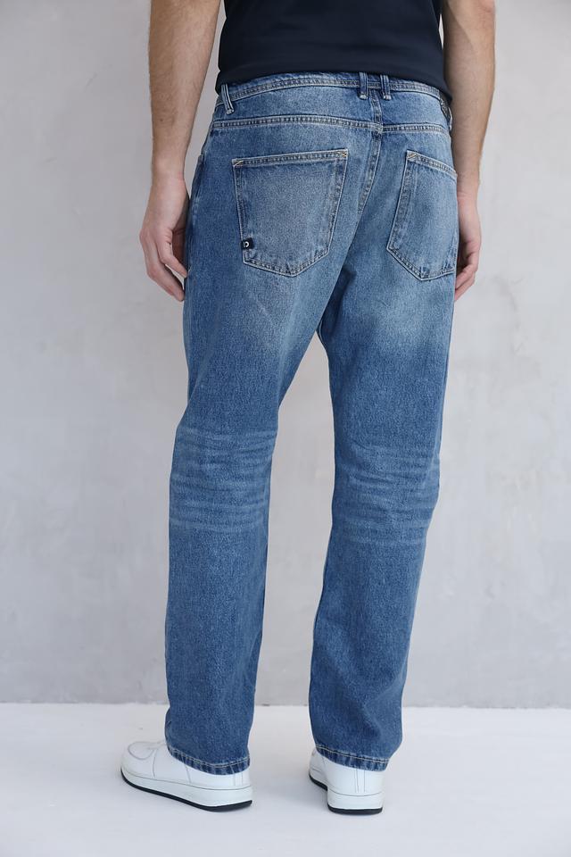 Джинсы имеют голубой цвет с эффектом потертости и выцветания, что придает им стильный и современный вид. Прямой крой обеспечивает свободу движений и подходит для различных типов фигуры. Классическая застежка на пуговицу и пять карманов делают эти джинсы практичными и функциональными.