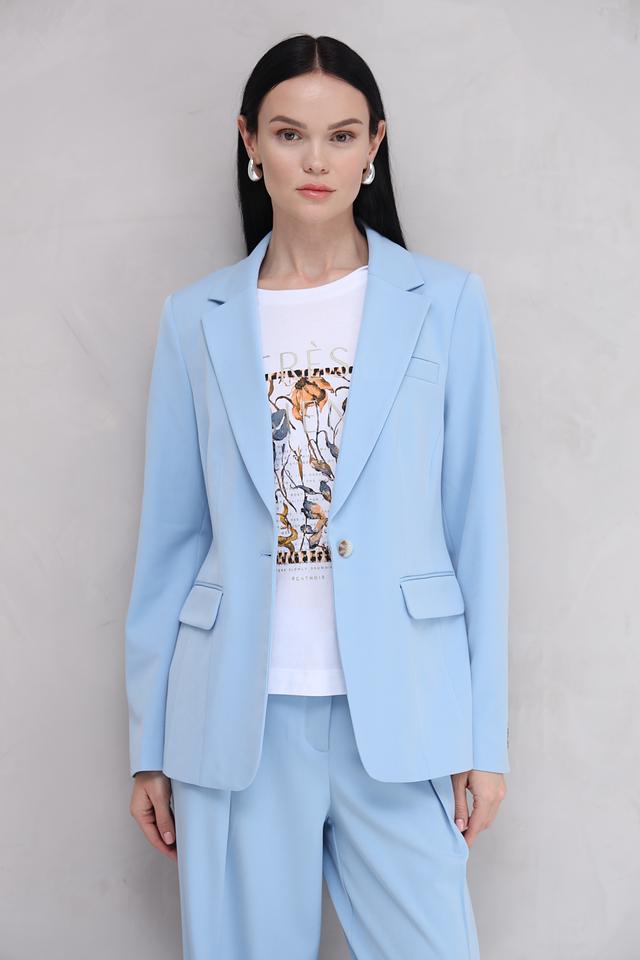 Женский жакет Tom Tailor голубого цвета – стильная и современная модель приталенного силуэта. Жакет имеет классический крой с лацканами и застежкой на пуговицы, а также декоративные золотистые пуговицы на рукавах. Состав: полиэстер 63%, вискоза 34%, эластан 3%