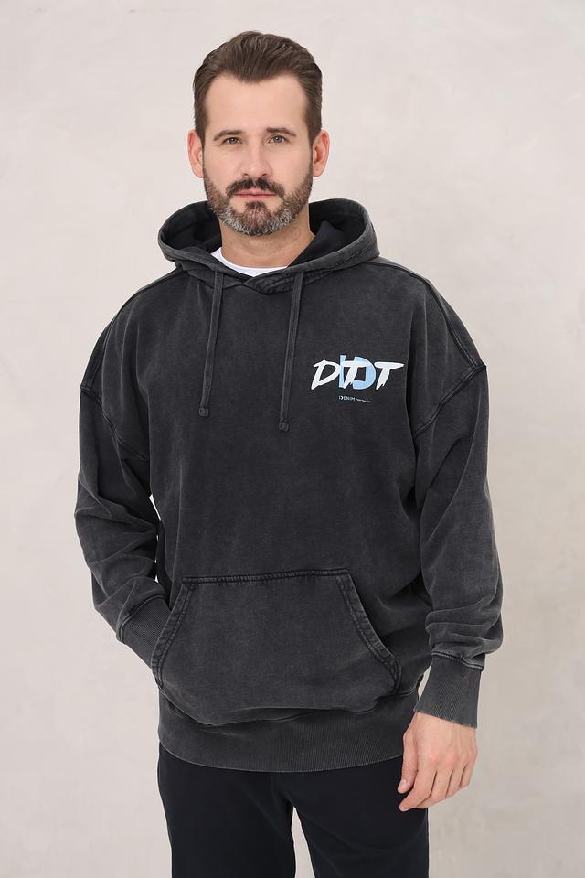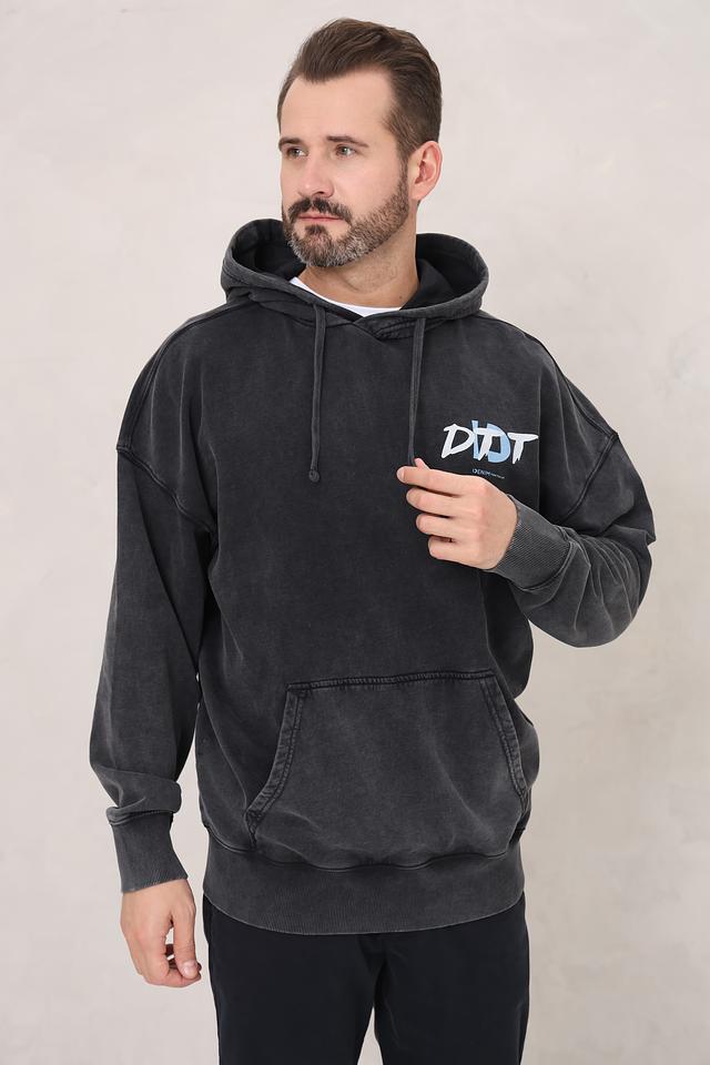 Модель имеет свободный крой, который не сковывает движения. Эффект washed denim придает толстовке винтажный вид. Спереди на груди расположен яркий белый принт с логотипом бренда, а на спине – крупная надпись "HASH VIBE 2007" в голубых тонах.