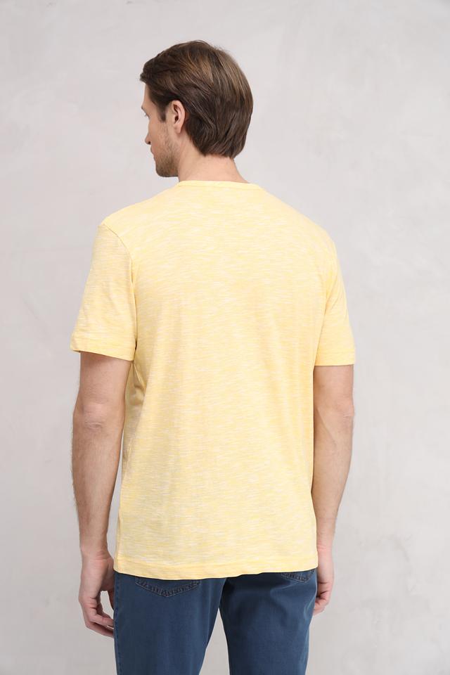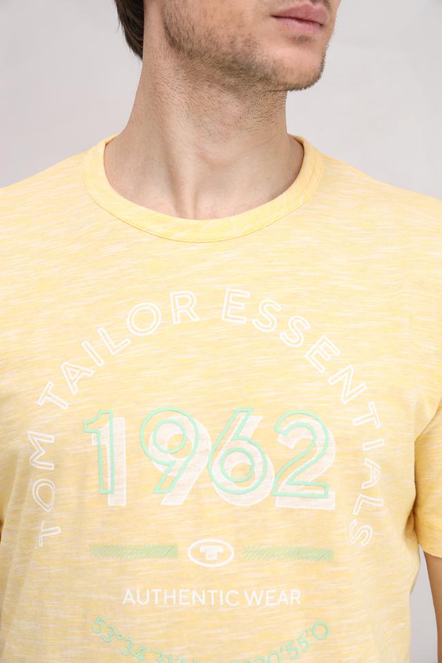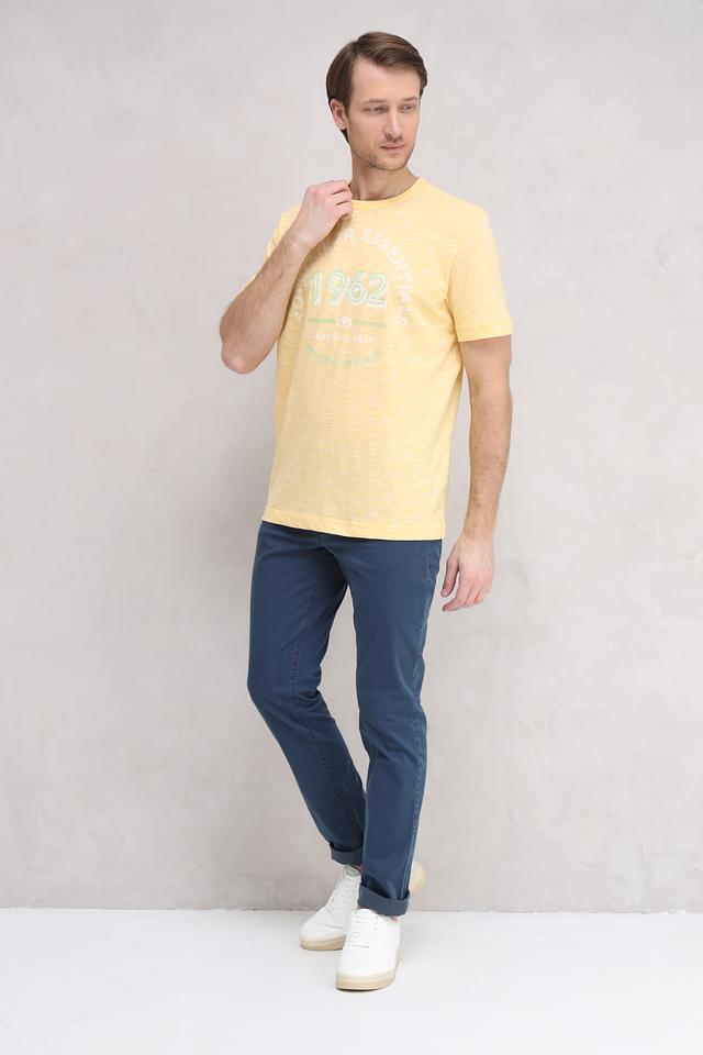 Мужская футболка Tom Tailor Essentials жёлтого цвета с круглым вырезом и оригинальным принтом на груди. Изготовлена из 100% хлопка, обеспечивающего комфорт и воздухопроницаемость. Стильный и практичный выбор для повседневного гардероба. Состав: хлопок 100%