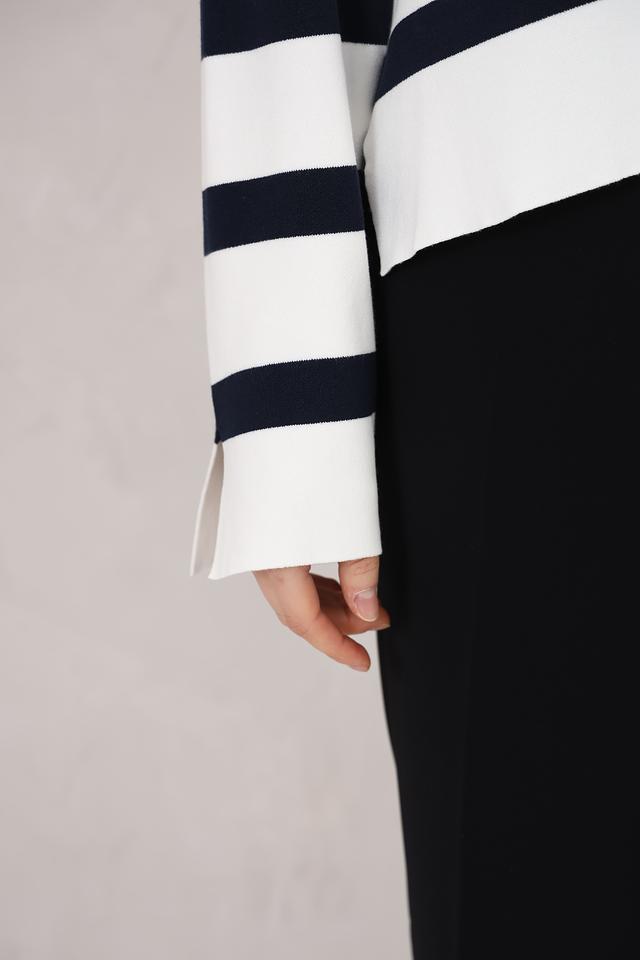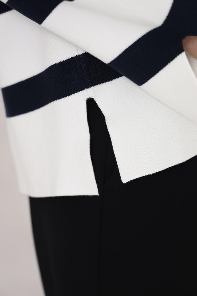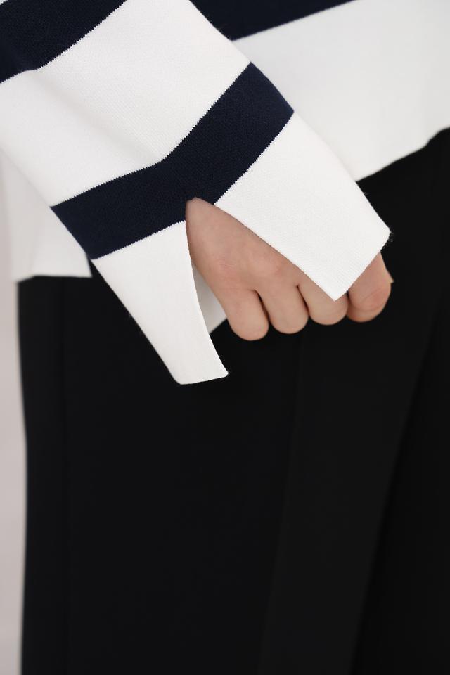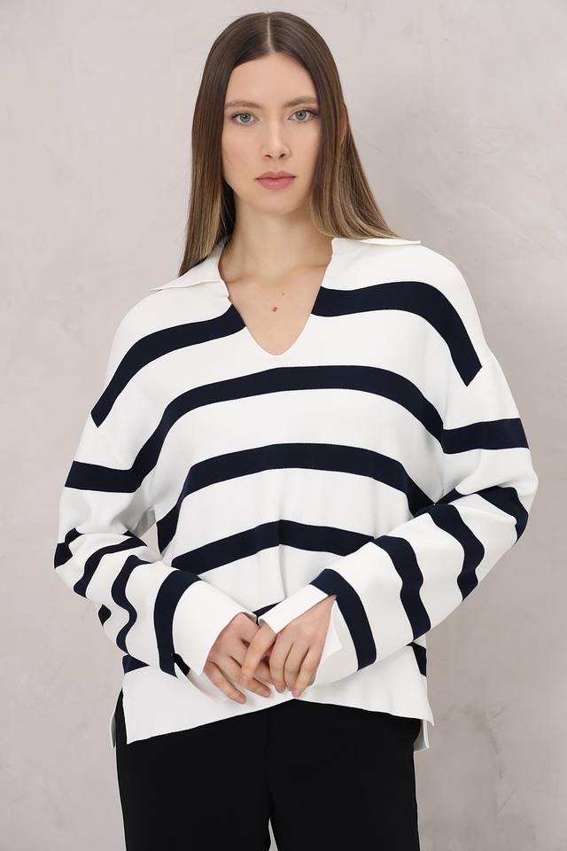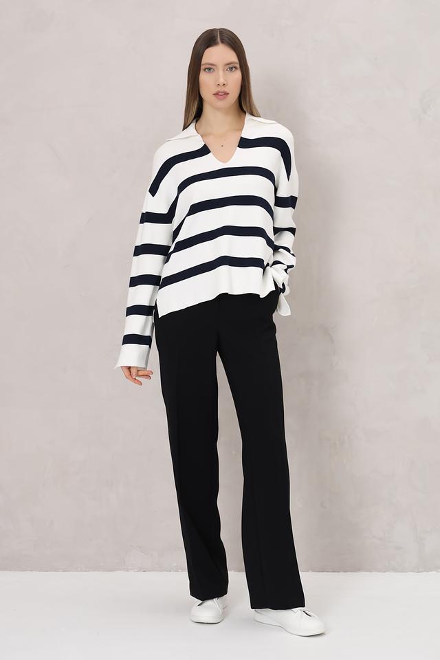 Модель имеет V-образный вырез, который визуально удлиняет шею и придает образу женственность. Длинные рукава с небольшими разрезами внизу добавляют оригинальности. Свободный крой обеспечивает комфорт при носке и позволяет создавать различные образы – от повседневных до более элегантных.