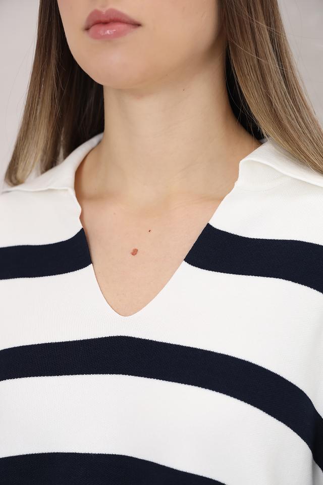 Женский пуловер Tom Tailor сине-белого цвета с V-образным вырезом и полосатым дизайном. Модель выполнена из мягкой вискозы с добавлением полиамида, что обеспечивает комфорт и приятные тактильные ощущения. Состав: вискоза 85%, полиамид 15%