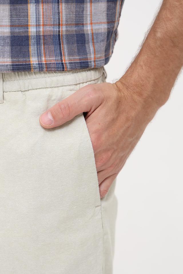 Шорты изготовлены из смеси льна и хлопка (55% лен, 45% хлопок), что делает их приятными на ощупь и хорошо пропускающими воздух. Эластичный пояс с регулирующим шнурком обеспечивает надежную посадку по фигуре.