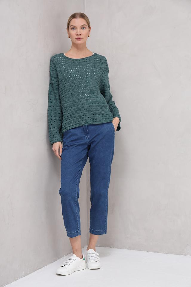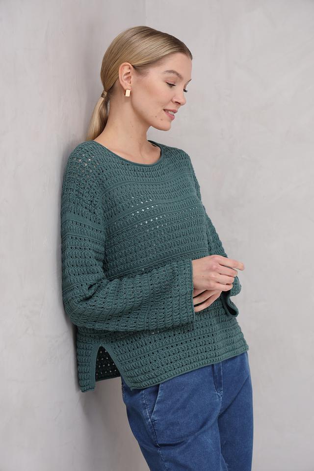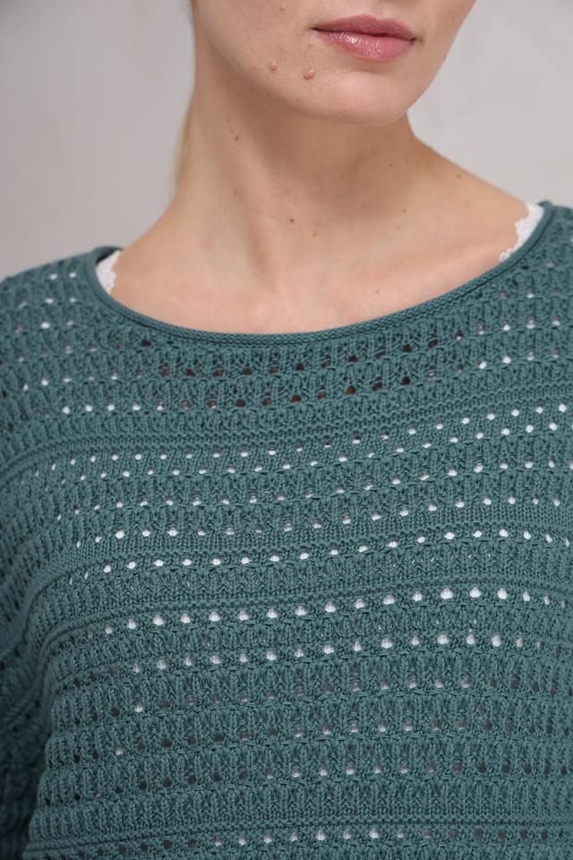 Пуловер имеет приятный зелёный цвет и выполнен в технике ажурного вязания, что придает ему легкость и оригинальность. Круглый вырез горловины и свободный крой делают его универсальным для различных типов фигур.
