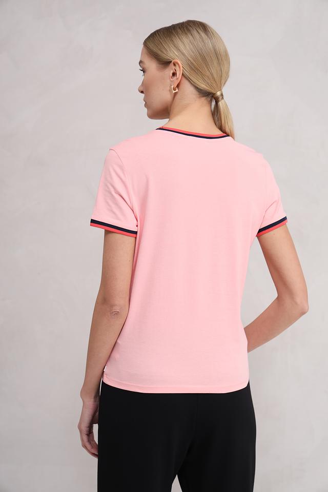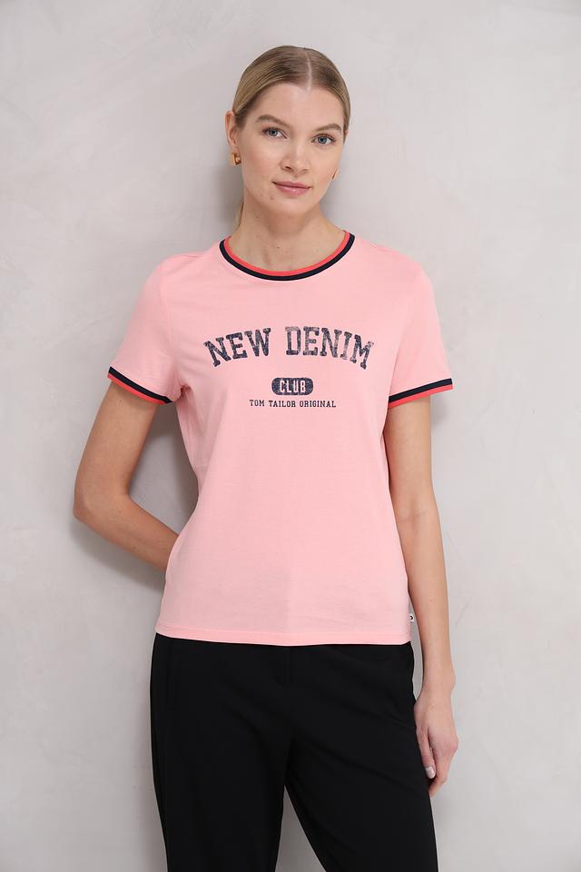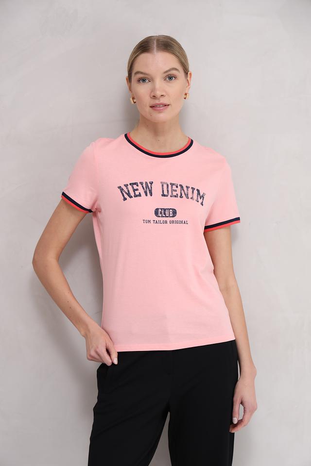 Розовая футболка Tom Tailor denim с принтом "NEW DENIM CLUB" и отделкой кантом. Изготовлена из 100% хлопка, обеспечивая комфорт и воздухопроницаемость. Стильный и удобный вариант для повседневного образа. Состав: хлопок 100%