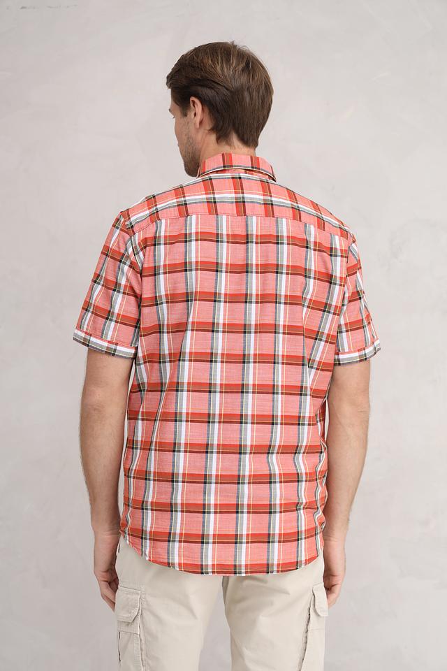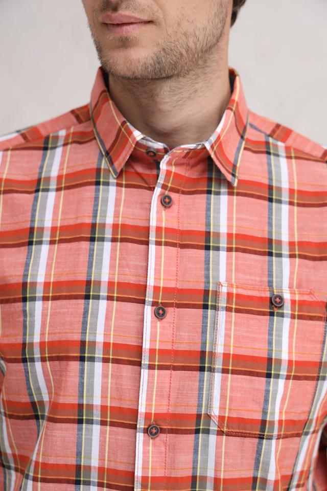 Рубашка имеет классический крой с короткими рукавами и стандартным воротником. Яркий клетчатый принт в оранжево-красной гамме с добавлением белых и серых полос делает эту рубашку заметной и стильной.