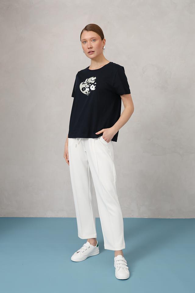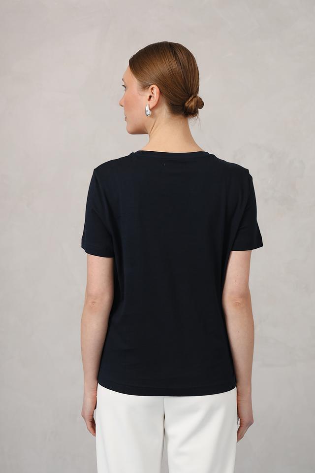 Футболка имеет классический прямой крой и короткие рукава. Основной цвет – темно-синий, который прекрасно сочетается с различными элементами одежды.