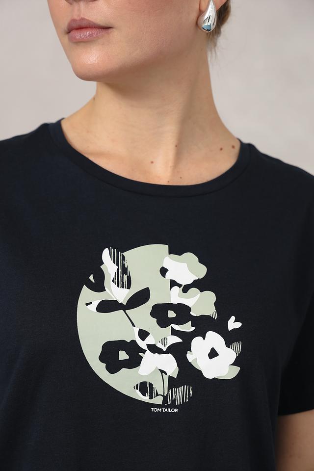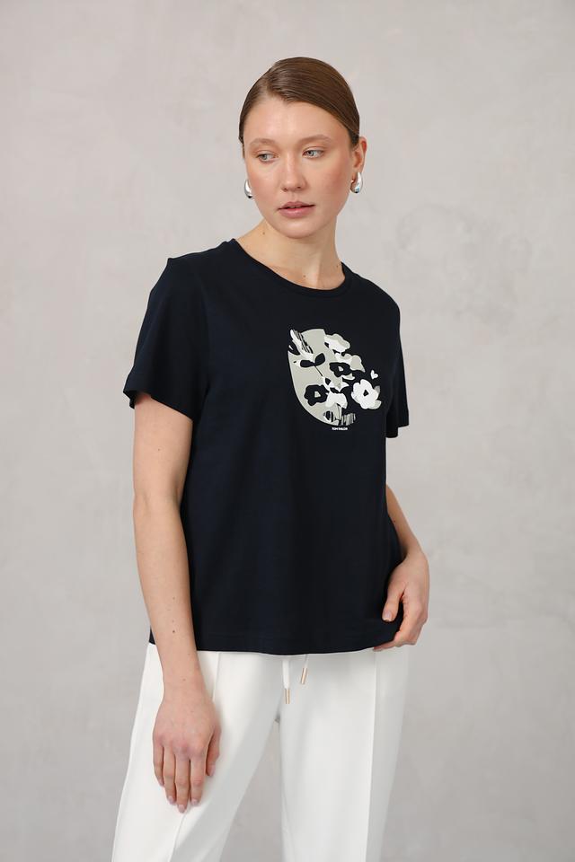 Женская футболка Tom Tailor темно-синего цвета с оригинальным цветочным принтом. Изготовлена из 100% хлопка, обеспечивающего комфорт и воздухопроницаемость. Стильный и удобный вариант для повседневного образа. Состав: хлопок 100%