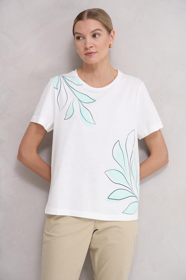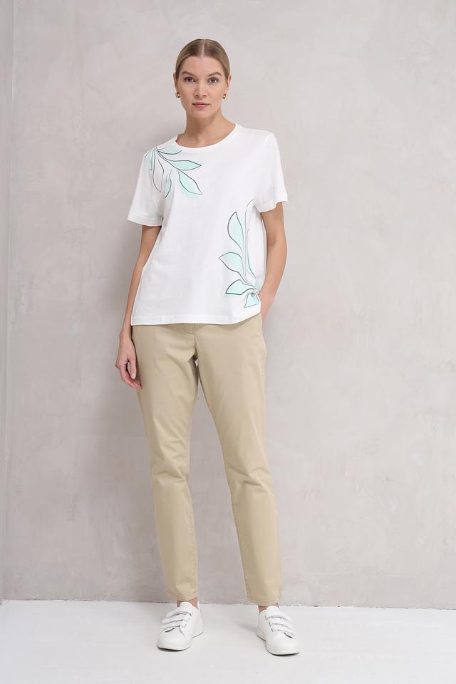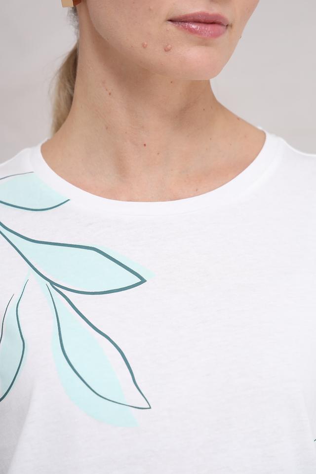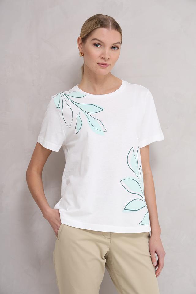 Основной цвет футболки – белый, который служит идеальным фоном для яркого и привлекательного принта в виде зелёных листьев.