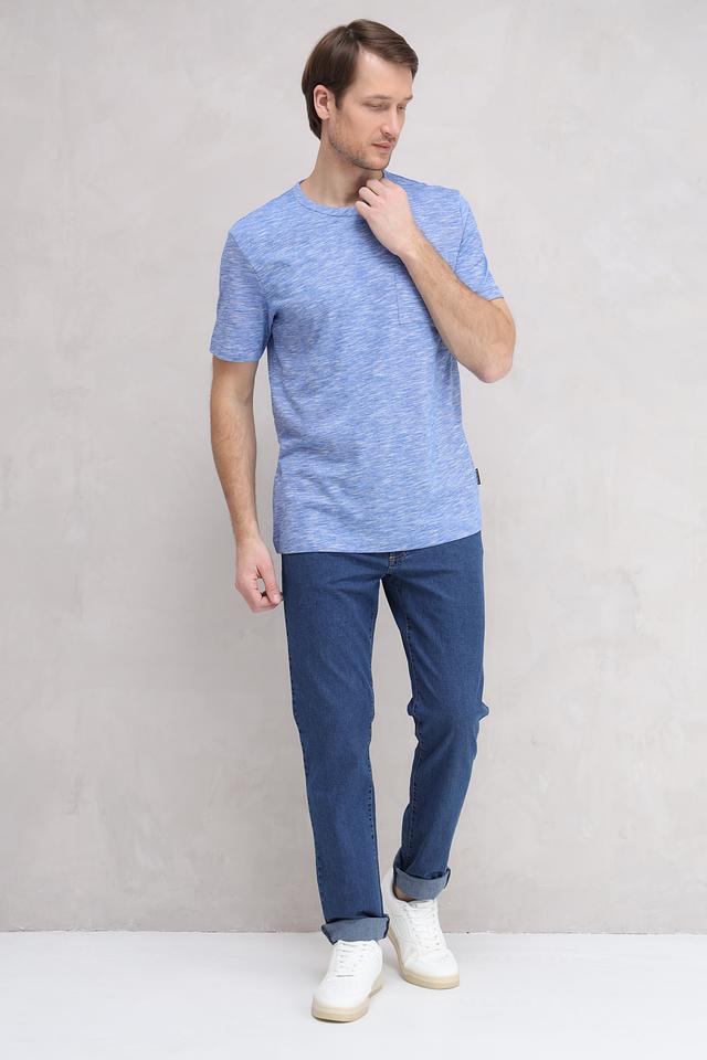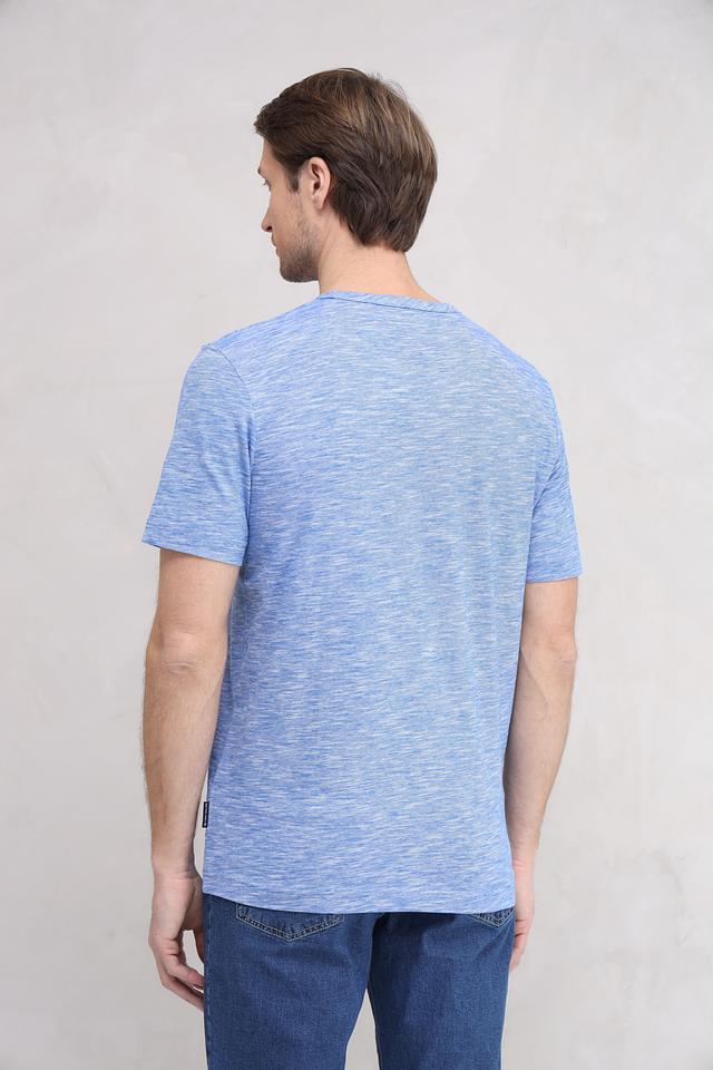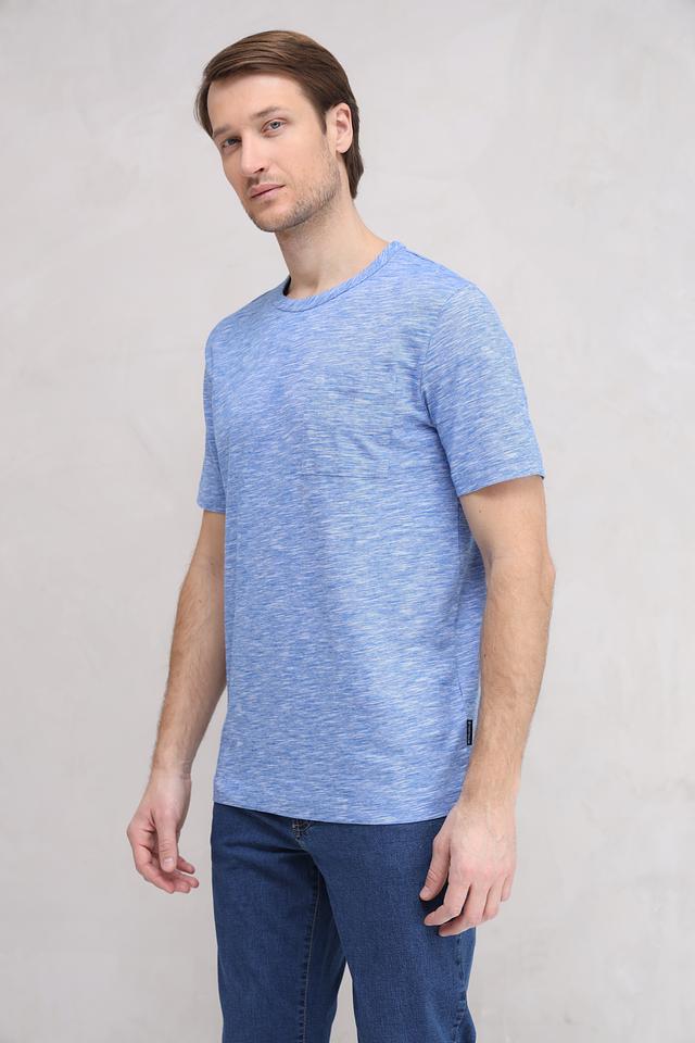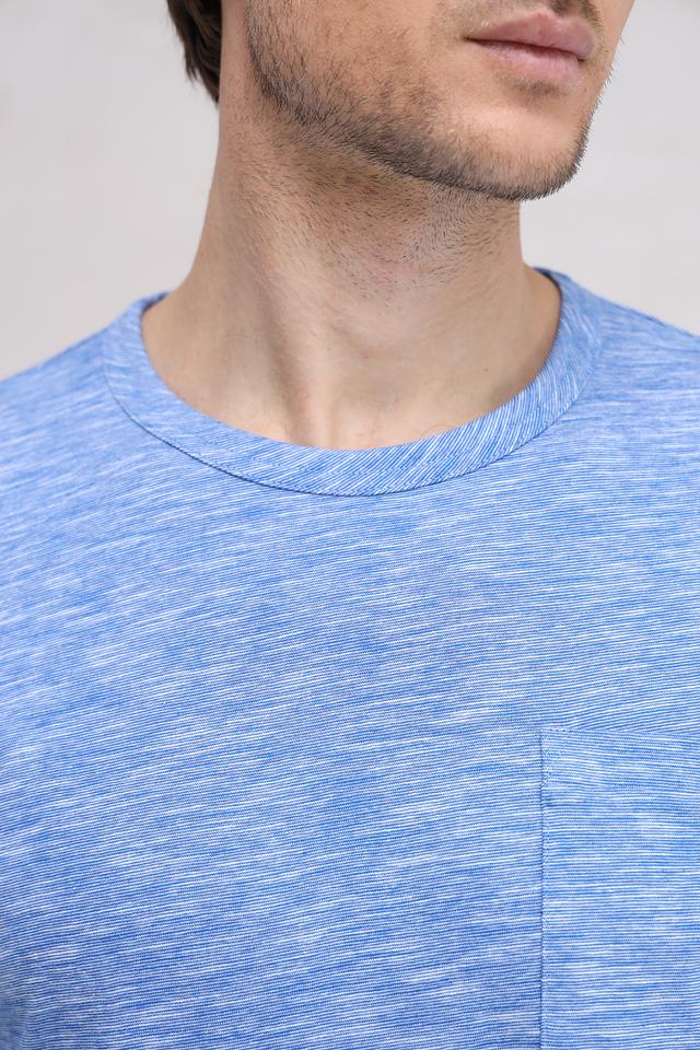 Футболка имеет классический крой и круглый вырез горловины. Меланжевая текстура придает ей современный и стильный вид. На левой стороне груди расположен небольшой накладной карман.