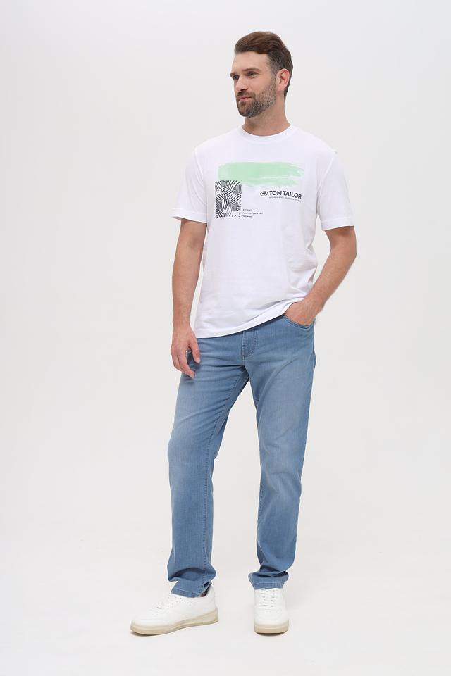 Основной цвет футболки – белый, что делает её универсальной и легко сочетаемой с другими элементами одежды. На передней части футболки расположен яркий принт с изображением зелёных листьев и логотипом бренда Tom Tailor.