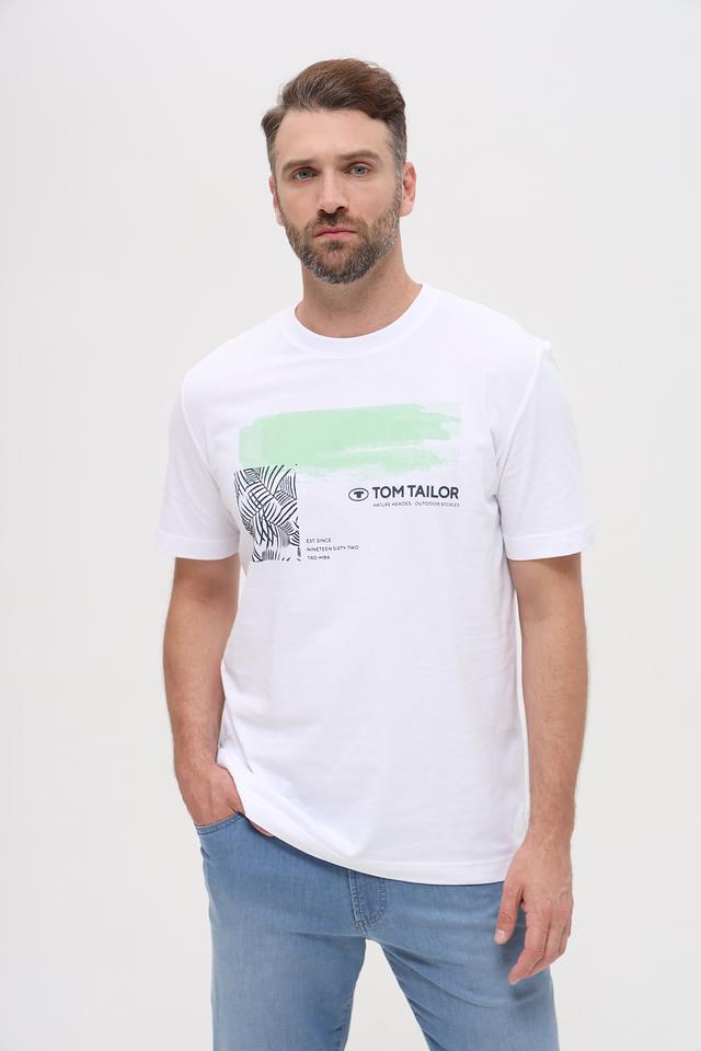 Белая футболка Tom Tailor с оригинальным принтом в виде зелёных листьев и логотипом бренда. Изготовлена из 100% хлопка, обеспечивающего комфорт и воздухопроницаемость. Состав: хлопок 100%