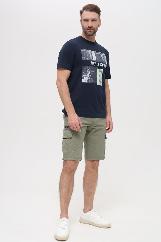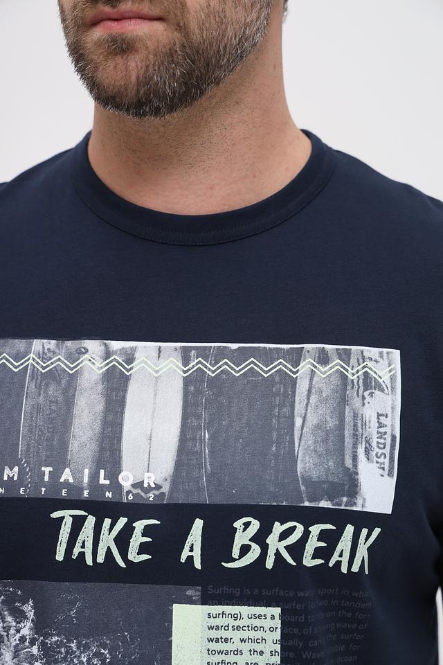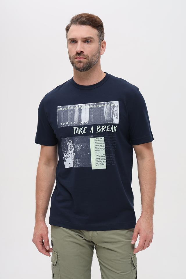 Мужская футболка Tom Tailor темно-синего цвета с оригинальным графическим принтом. Изготовлена из 100% хлопка, обеспечивающего комфорт и воздухопроницаемость. Стильный и удобный вариант для повседневного образа. Состав: хлопок 100%