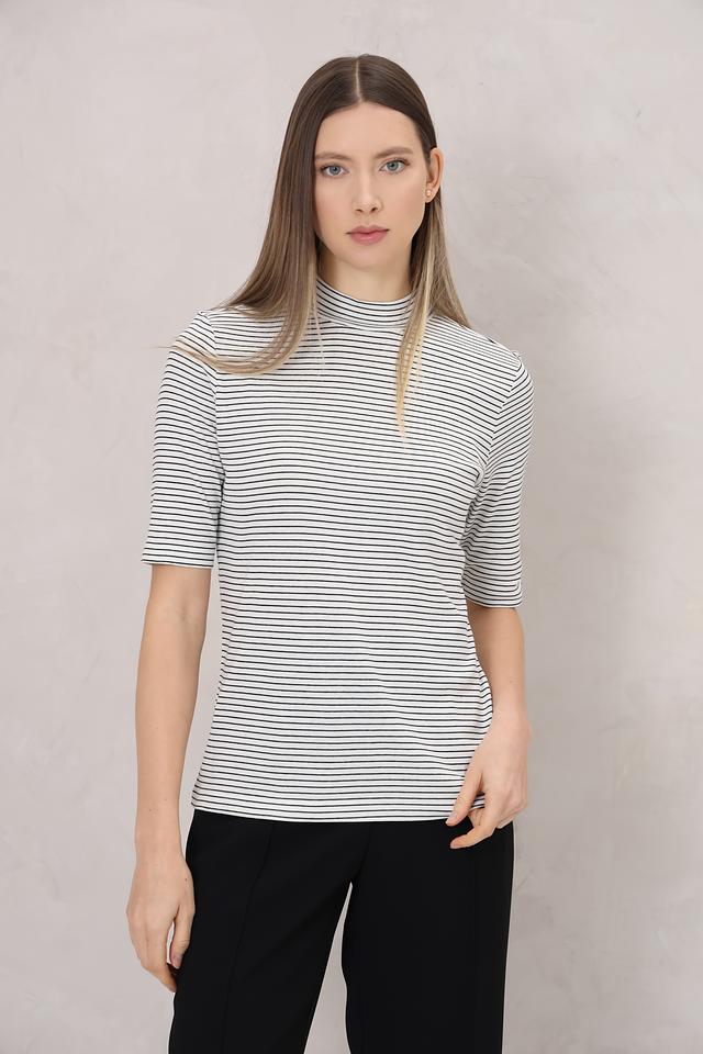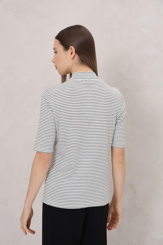 Модель выполнена из высококачественного 100% хлопка, что обеспечивает комфорт и приятные ощущения при носке. Высокий воротник добавляет изысканности и делает эту футболку подходящей для создания как повседневных, так и более элегантных образов.