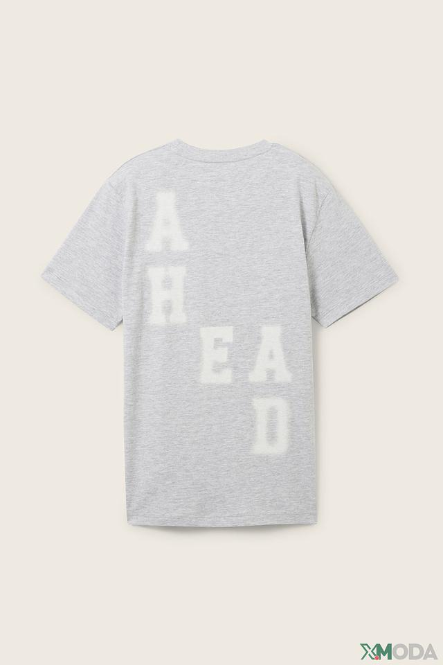 На передней части футболки отсутствует принт, а на задней части расположен стильный надпись “AHEAD”, выполненная в тон ткани. Такой минималистичный дизайн делает футболку универсальной и подходящей для различных случаев.