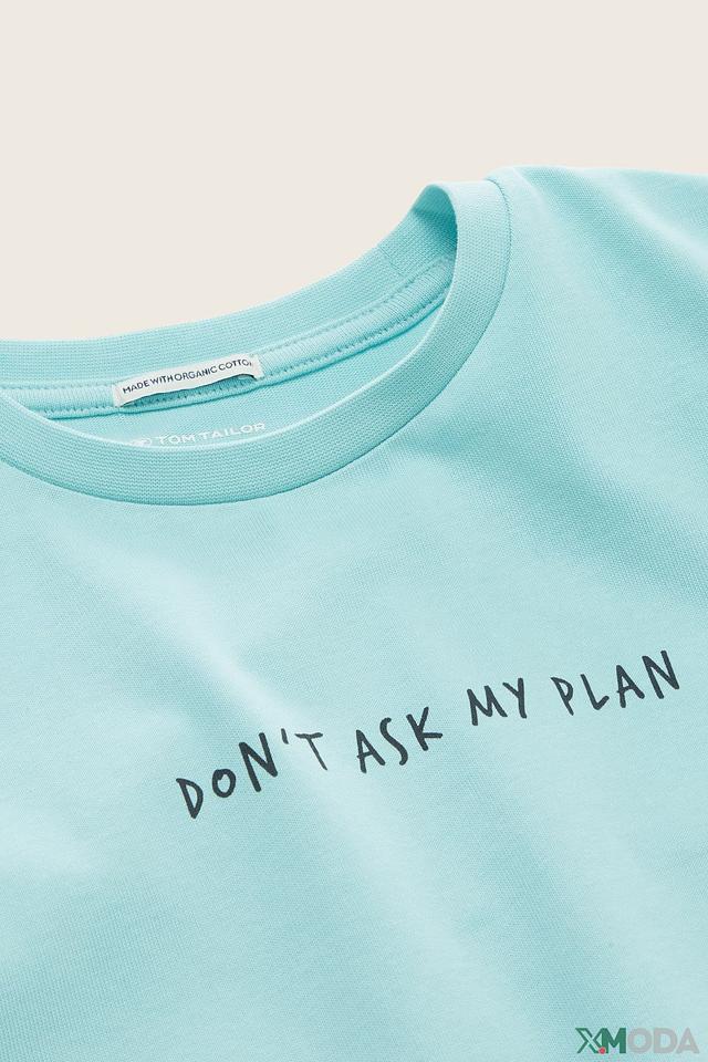 Эта футболка от Tom Tailor станет отличным дополнением к гардеробу вашего мальчика. Футболка выполнена в нежном голубом цвете и украшена стильной надписью "DON'T ASK MY PLAN" спереди.