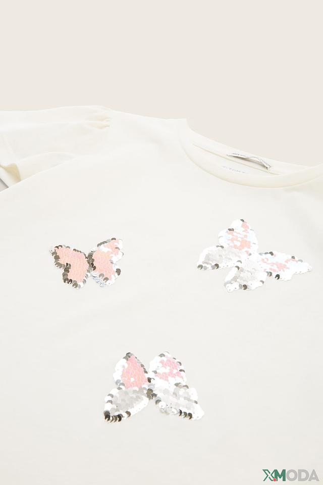 Основной цвет футболки – белый, который служит идеальным фоном для ярких аппликаций в виде бабочек. Бабочки выполнены в нежных розовых и голубых тонах с добавлением блестящих элементов, что придает им сказочный вид.
