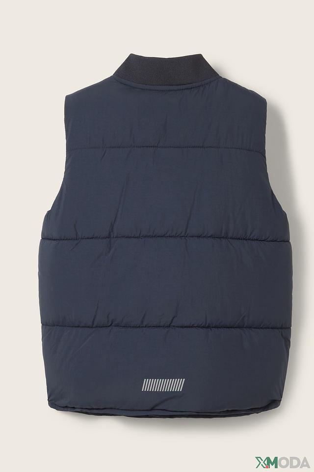 Жилет имеет стеганую фактуру, благодаря чему он хорошо держит форму и обеспечивает дополнительное утепление. Застежка на кнопках позволяет быстро и удобно надевать и снимать жилет. На внутренней стороне расположен ярлычок с надписью “Stunning Piece is property of Name”, что добавляет изделию индивидуальности.