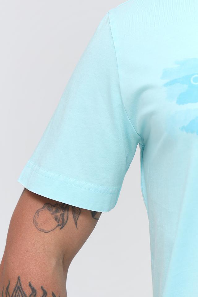 Футболка имеет голубой цвет и украшена ярким принтом Cali Sundowner с изображением пальм и надписями. Принт выполнен в белом и сером цветах, что создает контрастный и стильный вид.