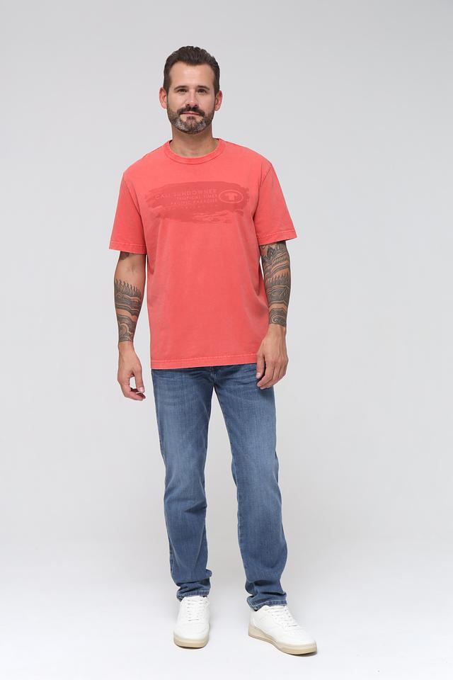 Мужская футболка Tom Tailor кораллового цвета с принтом и эффектом потертости. Изготовлена из 100% хлопка, обеспечивающего комфорт и воздухопроницаемость. Отличный выбор для повседневного образа. Состав: хлопок 100%