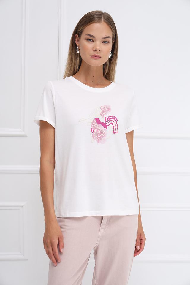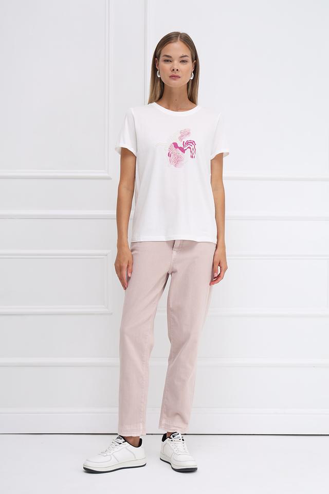 Особенностью данной модели является яркий и стильный цветочный принт в розовых тонах, который добавляет образу женственности и индивидуальности. Футболка имеет классический прямой крой и короткие рукава, что делает ее идеальной для теплой погоды.