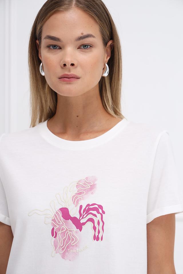 Белая футболка Tom Tailor с оригинальным цветочным принтом. Изготовлена из 100% хлопка, обеспечивающего комфорт и воздухопроницаемость. Стильный и универсальный вариант для повседневного образа. Состав: хлопок 100%