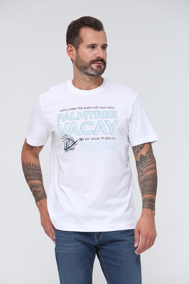 Белая футболка Tom Tailor с ярким принтом в стиле "vacay". Изготовлена из 100% хлопка, обеспечивая комфорт и воздухопроницаемость. Отличный выбор для создания непринужденного летнего образа. Состав: хлопок 100%