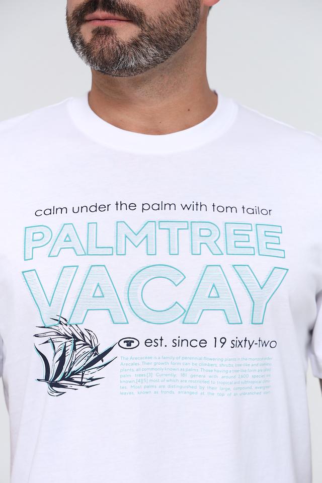 Футболка Tom Tailor – это стильный и удобный элемент мужского гардероба. Выполнена в белом цвете и украшена ярким принтом с надписью "PALMTREE VACAY" и изображением пальмы.
