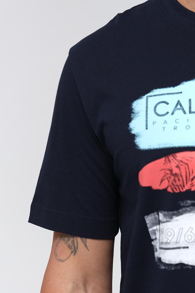 Футболка выполнена в насыщенном синем цвете и украшена эффектным принтом с изображением пальм и надписью "CALI COCKTAIL". Принт выполнен в ярких цветах, что добавляет образу динамичности и оригинальности.