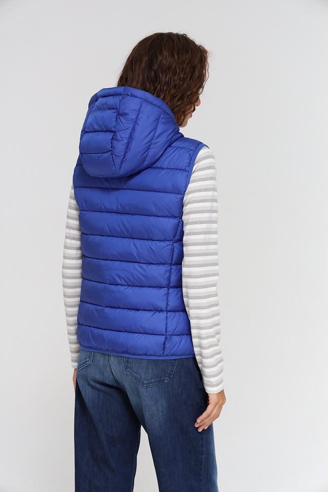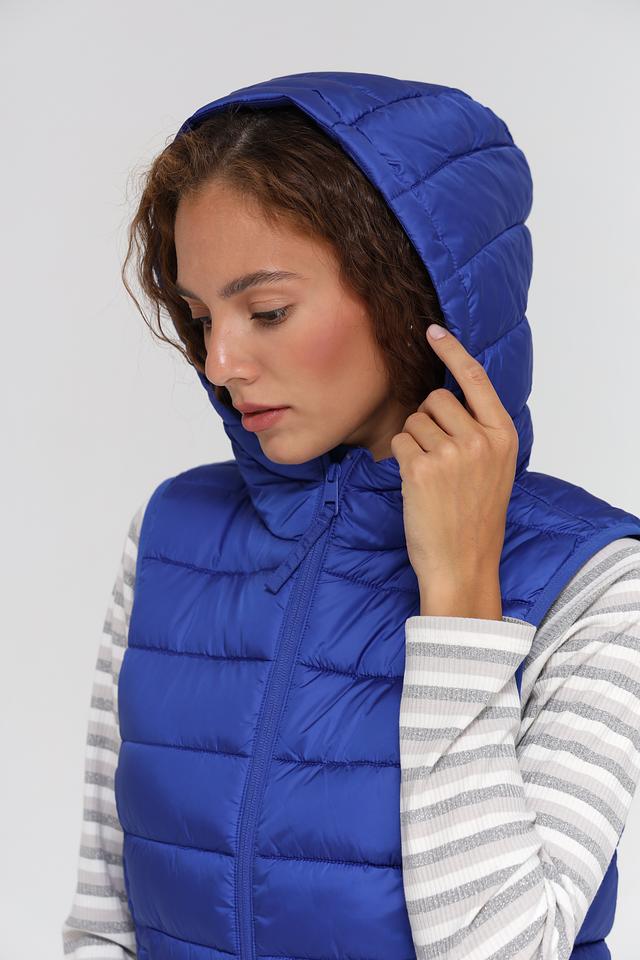 Жилет имеет стеганую текстуру и удобный капюшон, который защитит от ветра и легкого дождя. Застежка-молния позволяет легко надевать и снимать жилет, а также регулировать степень теплоизоляции.
