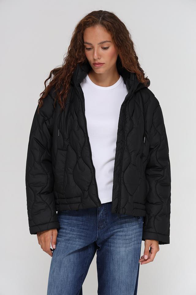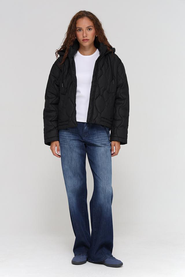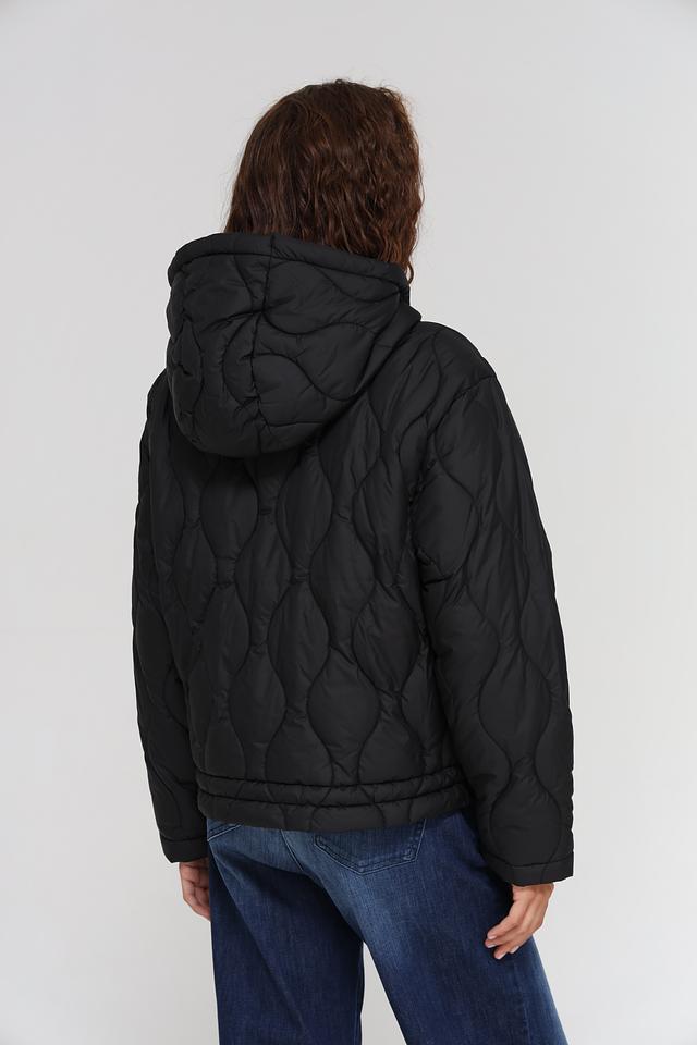 Куртка имеет стёганую текстуру, которая придает ей современный вид. Капюшон с регулируемыми шнурками обеспечивает дополнительную защиту от ветра и непогоды. Застежка-молния позволяет быстро и удобно надевать и снимать куртку.