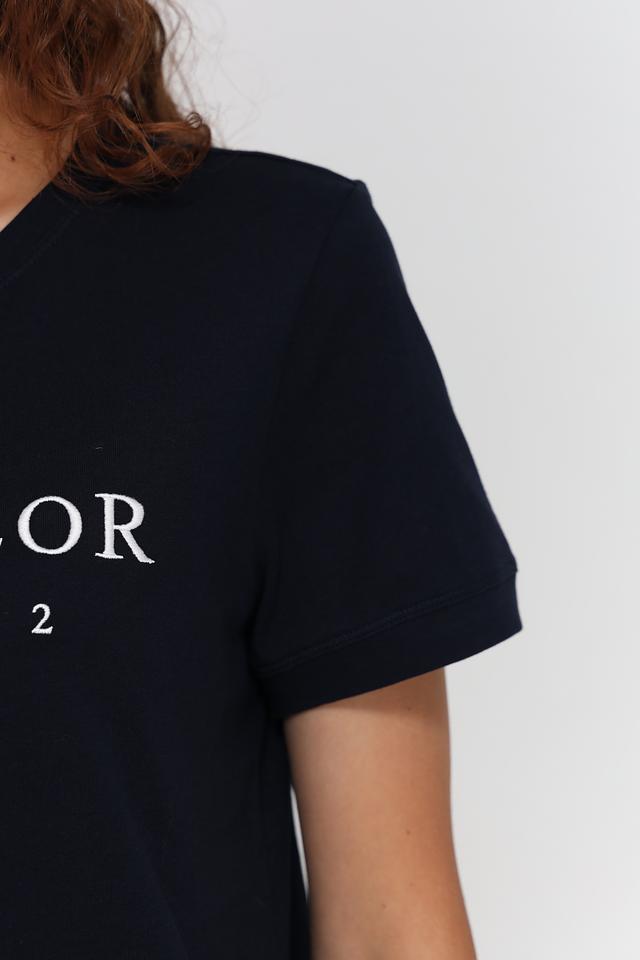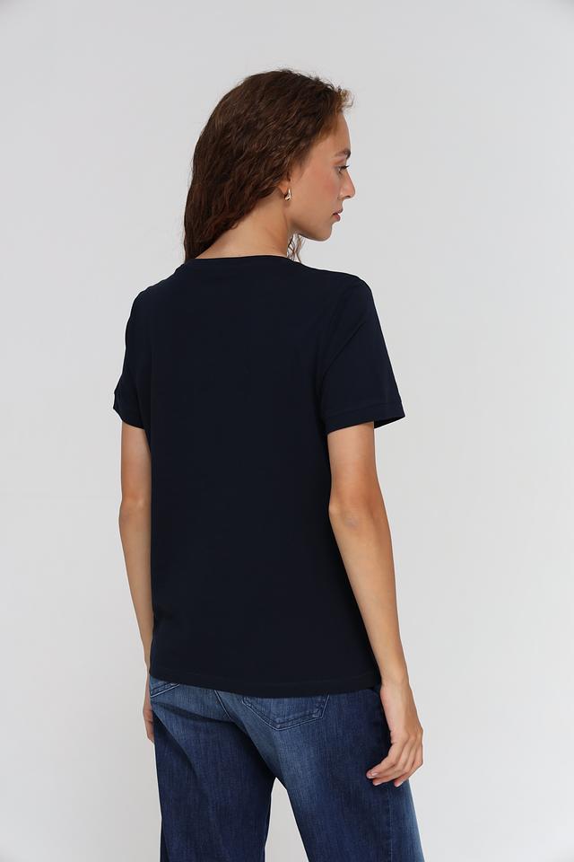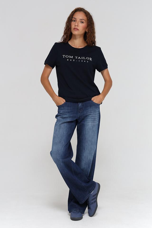 Модель имеет прямой крой и круглый вырез горловины, что обеспечивает комфортную посадку. На передней части футболки расположен логотип бренда Tom Tailor и надпись "EST. 1962", выполненные в белом цвете, что добавляет стильный акцент.