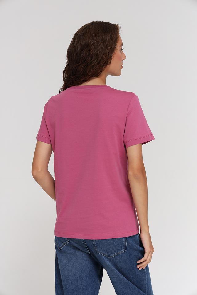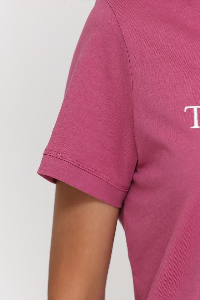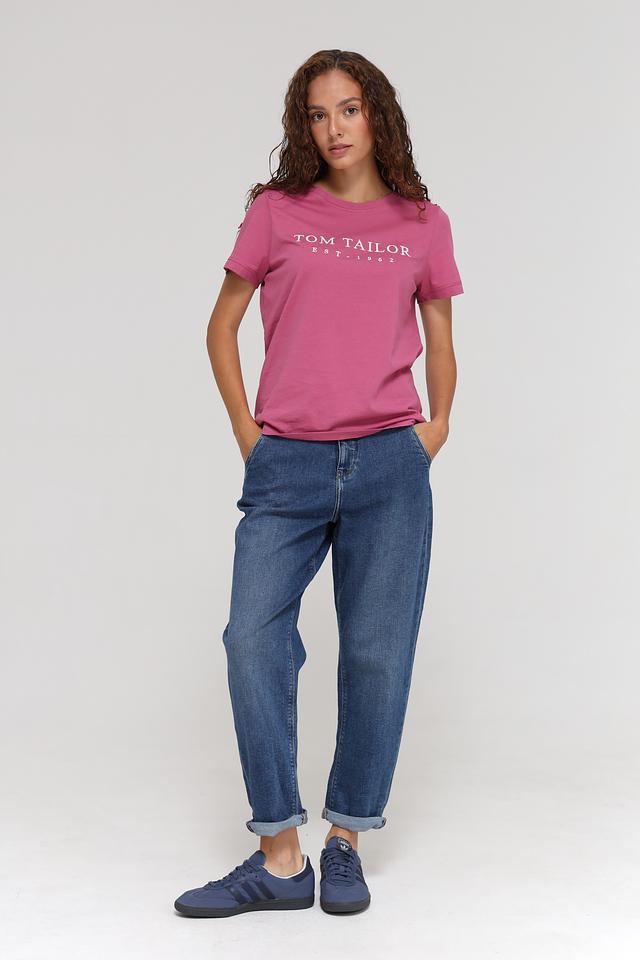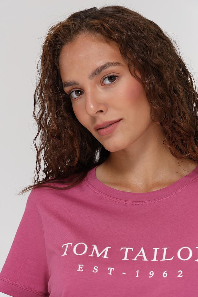 Женская футболка Tom Tailor малинового цвета с круглым вырезом и логотипом бренда на груди. Изготовлена из 100% хлопка, обеспечивающего комфорт и воздухопроницаемость. Состав: хлопок 100%
