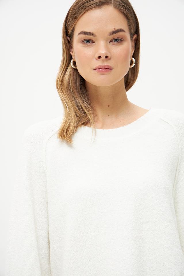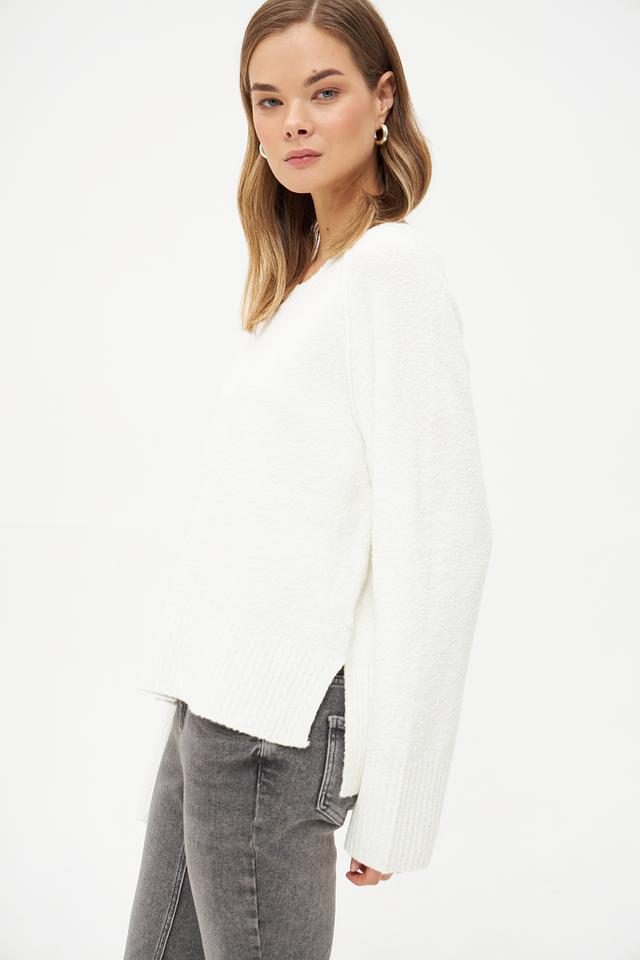 Особенностью модели являются объёмные рукава-колокол, придающие образу женственность и лёгкость. Пуловер имеет круглый вырез горловины и гладкую текстуру.