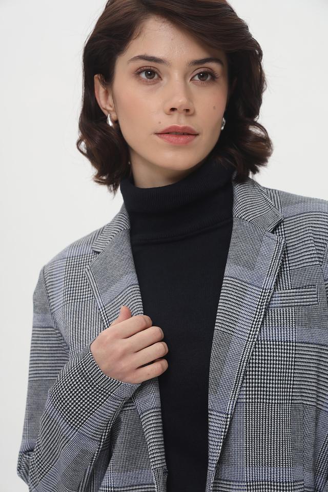 Модель имеет приталенный силуэт, который подчеркивает фигуру. Застежка на пуговицы обеспечивает надежную фиксацию. Жакет имеет стандартную длину и рукава с манжетами.